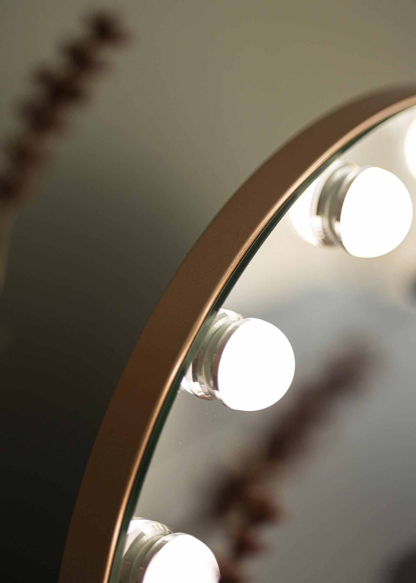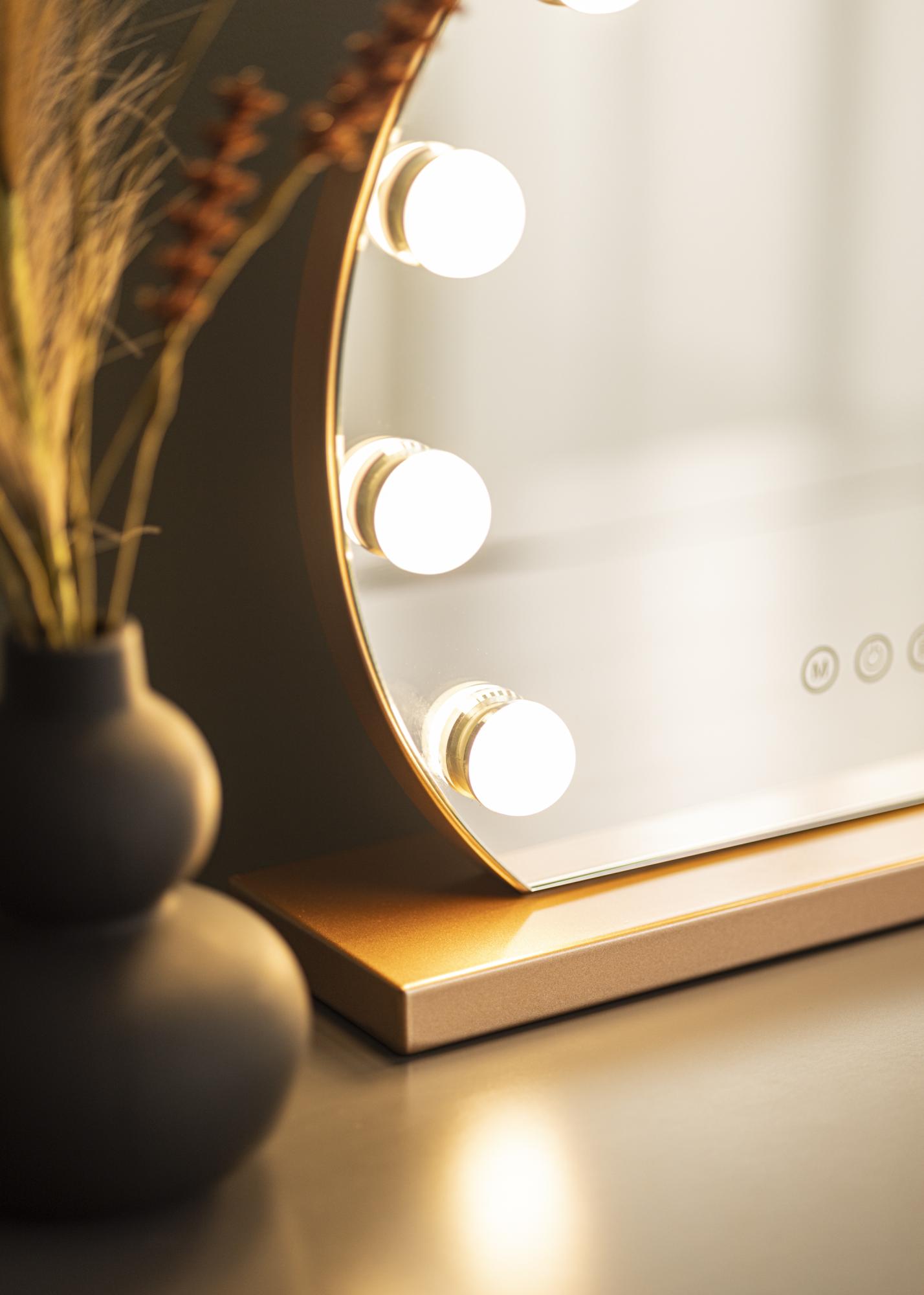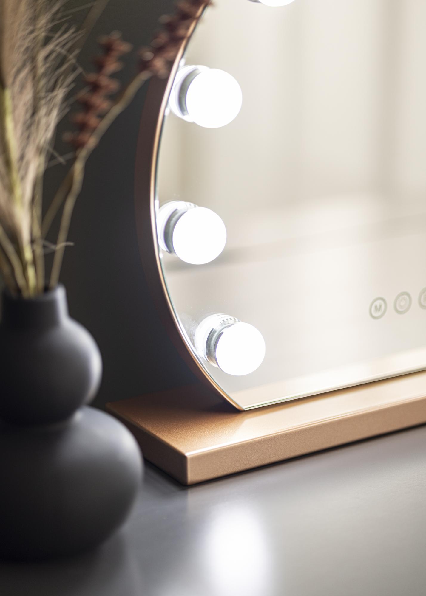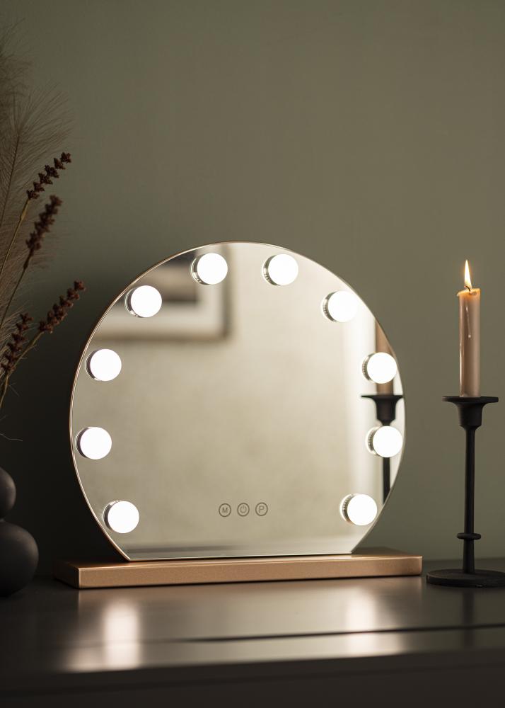 Sellel peeglil on klassikaline ümmargune kuju, millel on 10 suurt LED-lampi, mis raamivad 40x30 cm suurust peegelduse pinda. See annab eksklusiivse ilme, mida täiendab peegli jalg moodsas roosa kulla toonis. Sisseehitatud valgustuse süütate puutenupuga peegli esiküljel. Teil on võimalus seadistada valguse värvitemperatuuri ja heledust vastavalt oma soovile. Ka see toimub mugavate puutenupudega, mis on märgitud "M" värvitemperatuuri reguleerimiseks ja "P" heledustaseme seadistamiseks. Kolm värvitemperatuuri, mille vahel saate valida, on soe, külm ja loomulik valgus.