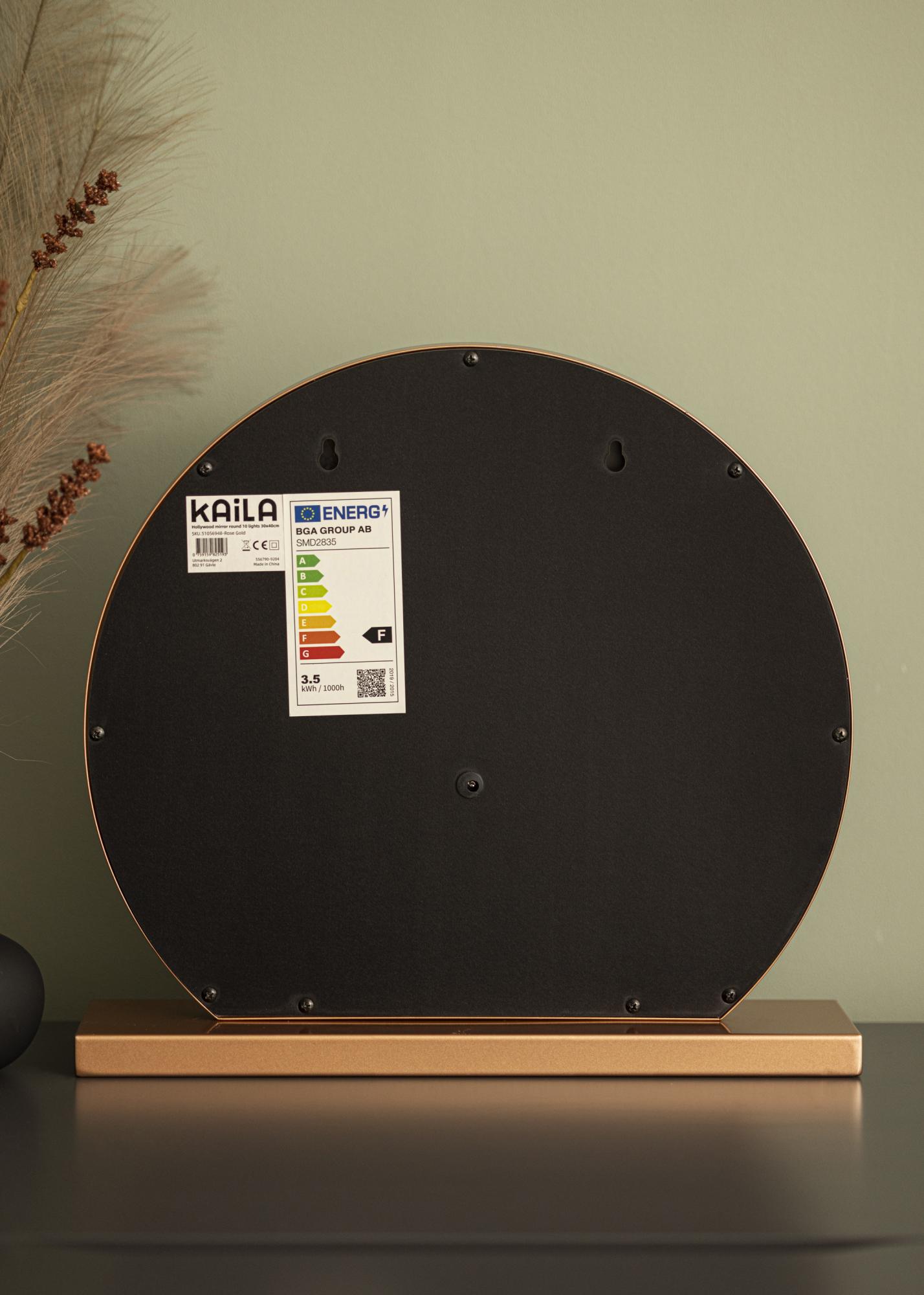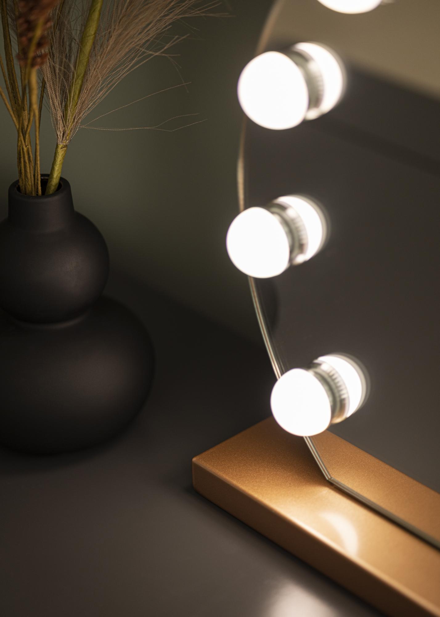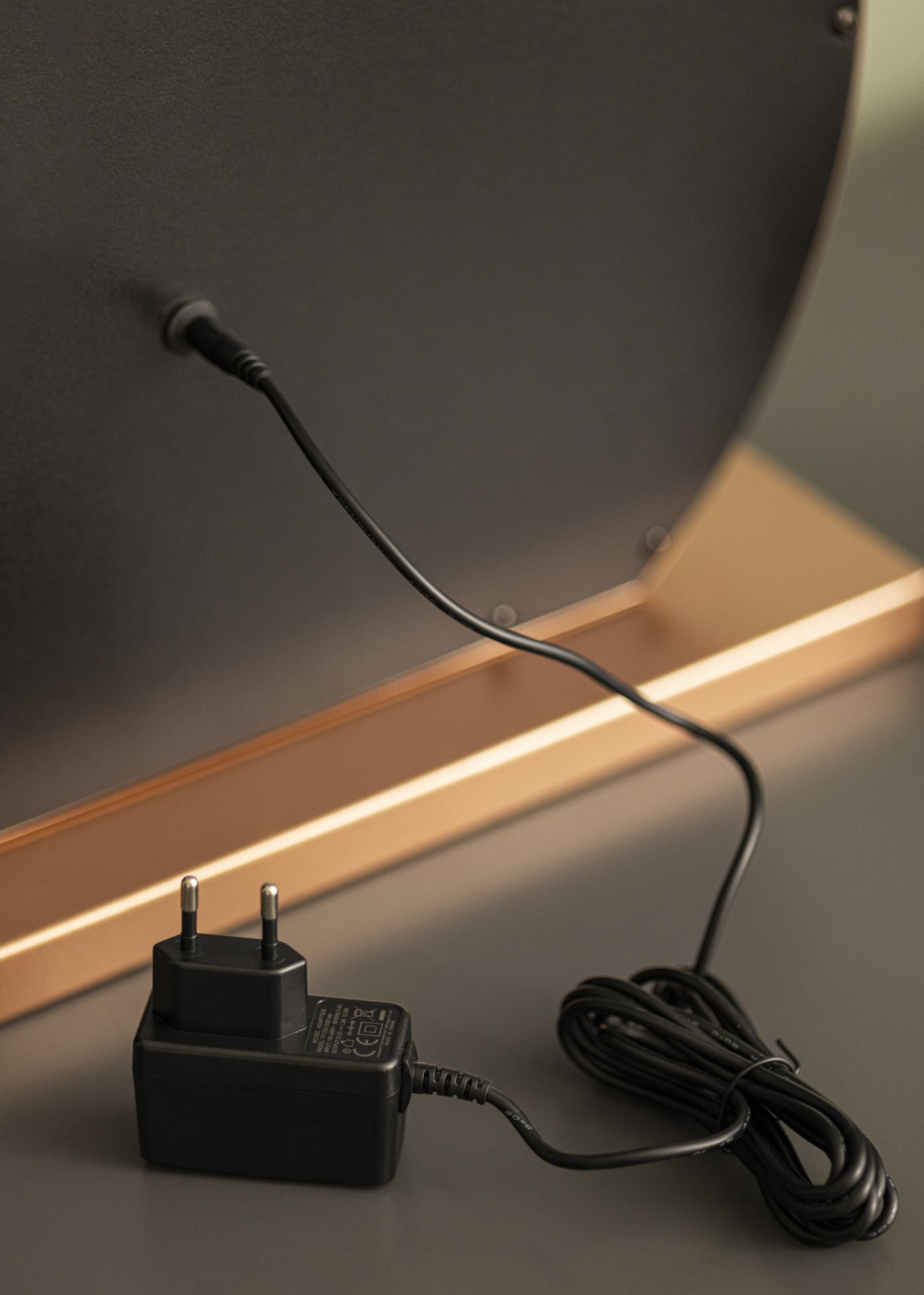 Sellel peeglil on klassikaline ümmargune kuju, millel on 10 suurt LED-lampi, mis raamivad 40x30 cm suurust peegelduse pinda. See annab eksklusiivse ilme, mida täiendab peegli jalg moodsas roosa kulla toonis. Sisseehitatud valgustuse süütate puutenupuga peegli esiküljel. Teil on võimalus seadistada valguse värvitemperatuuri ja heledust vastavalt oma soovile. Ka see toimub mugavate puutenupudega, mis on märgitud "M" värvitemperatuuri reguleerimiseks ja "P" heledustaseme seadistamiseks. Kolm värvitemperatuuri, mille vahel saate valida, on soe, külm ja loomulik valgus.