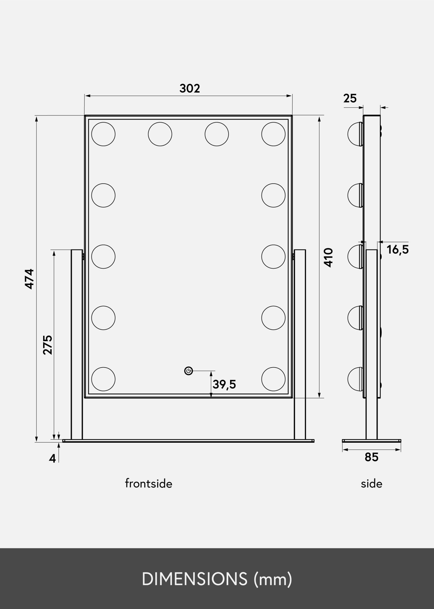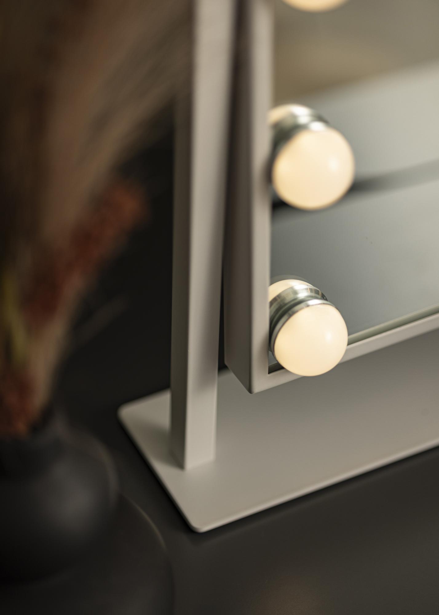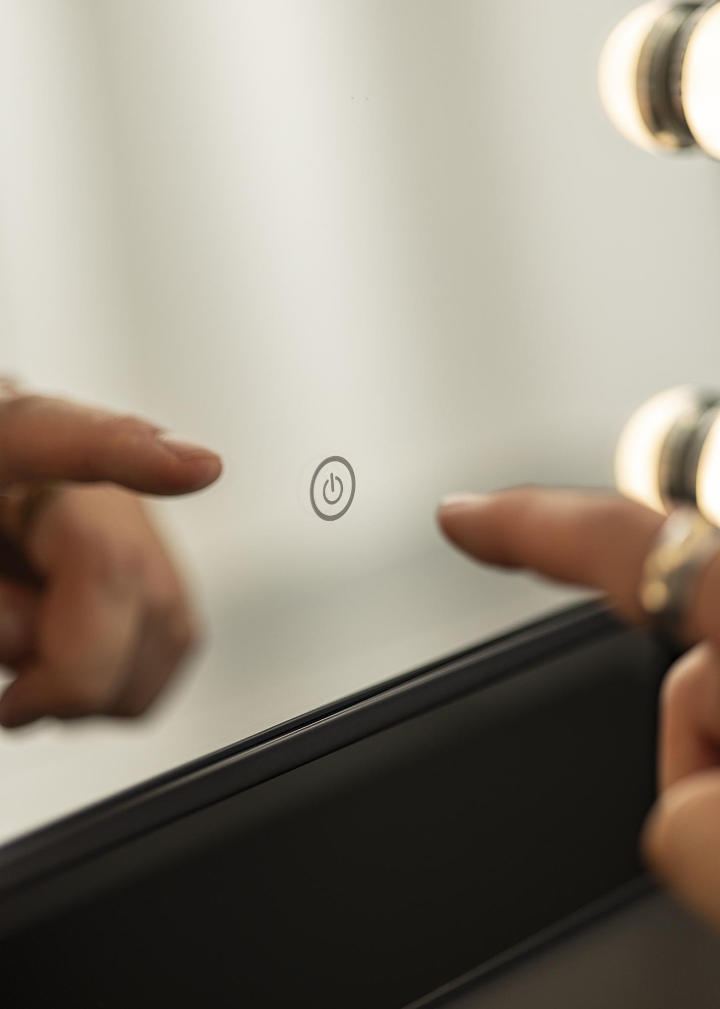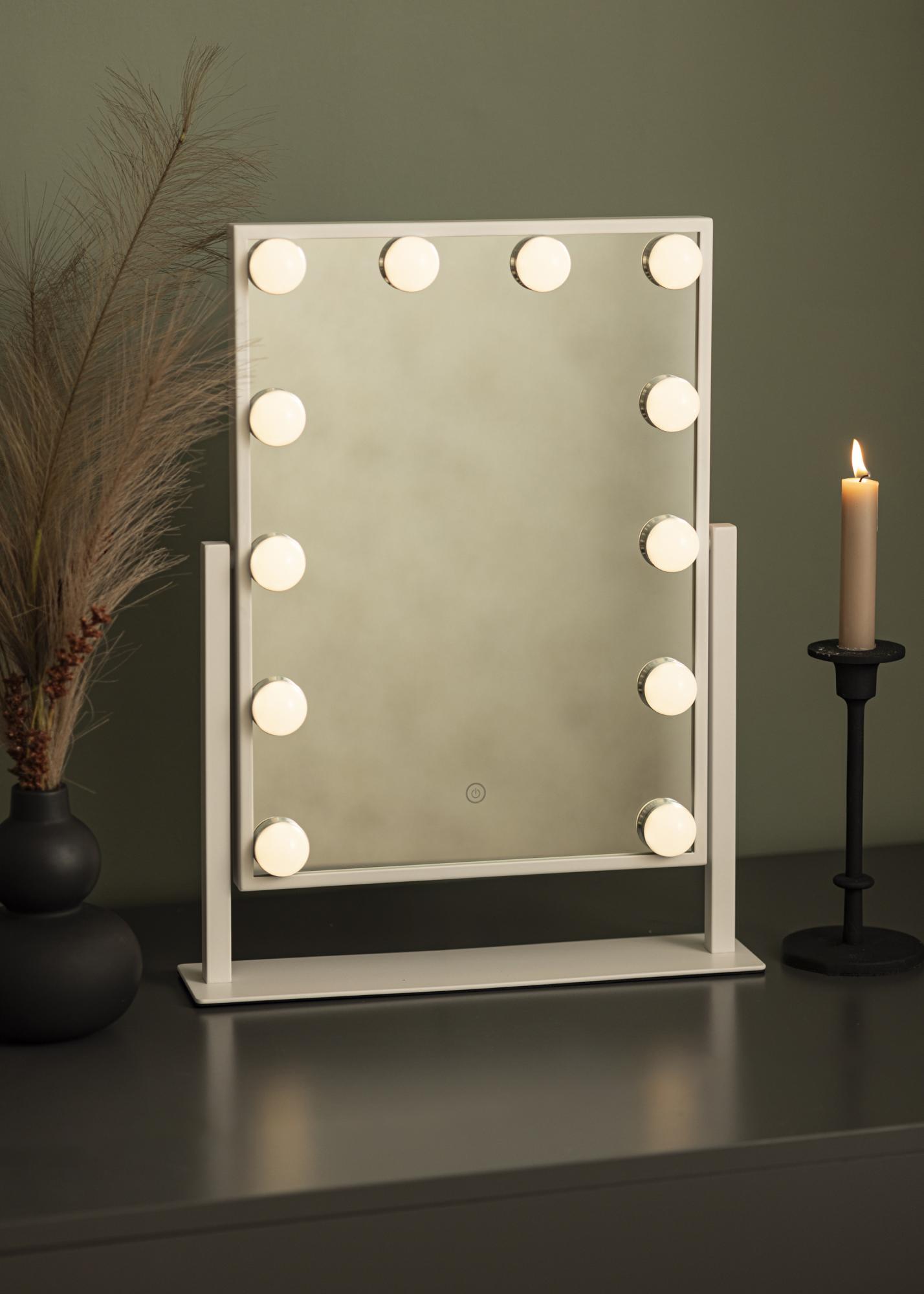 See on luksusliku disainiga meigipeegel, millel on 12 dekoratiivset LED pirni elegantses valges toonis. Pirnid raamivad stiilselt helde peegelpinna, mõõtmetega 30x40 cm, ning annavad sooja valget valgust 3000K. Valgustus lülitatakse sisse, vajutades ekraani puuteplaati, ja sellel on hämardamisfunktsioon, mida saab lihtsalt reguleerida nuppu paar sekundit hoides. Peegel on võimalik kallutada vertikaalselt, et saaksid end meikida sellest nurgast, mis sobib sulle kõige paremini. Lisaks oma arvukatele funktsioonidele muutub see meigipeegel kodus elegantseks detailiks ja loob tõelise Hollywoodi tunde!
