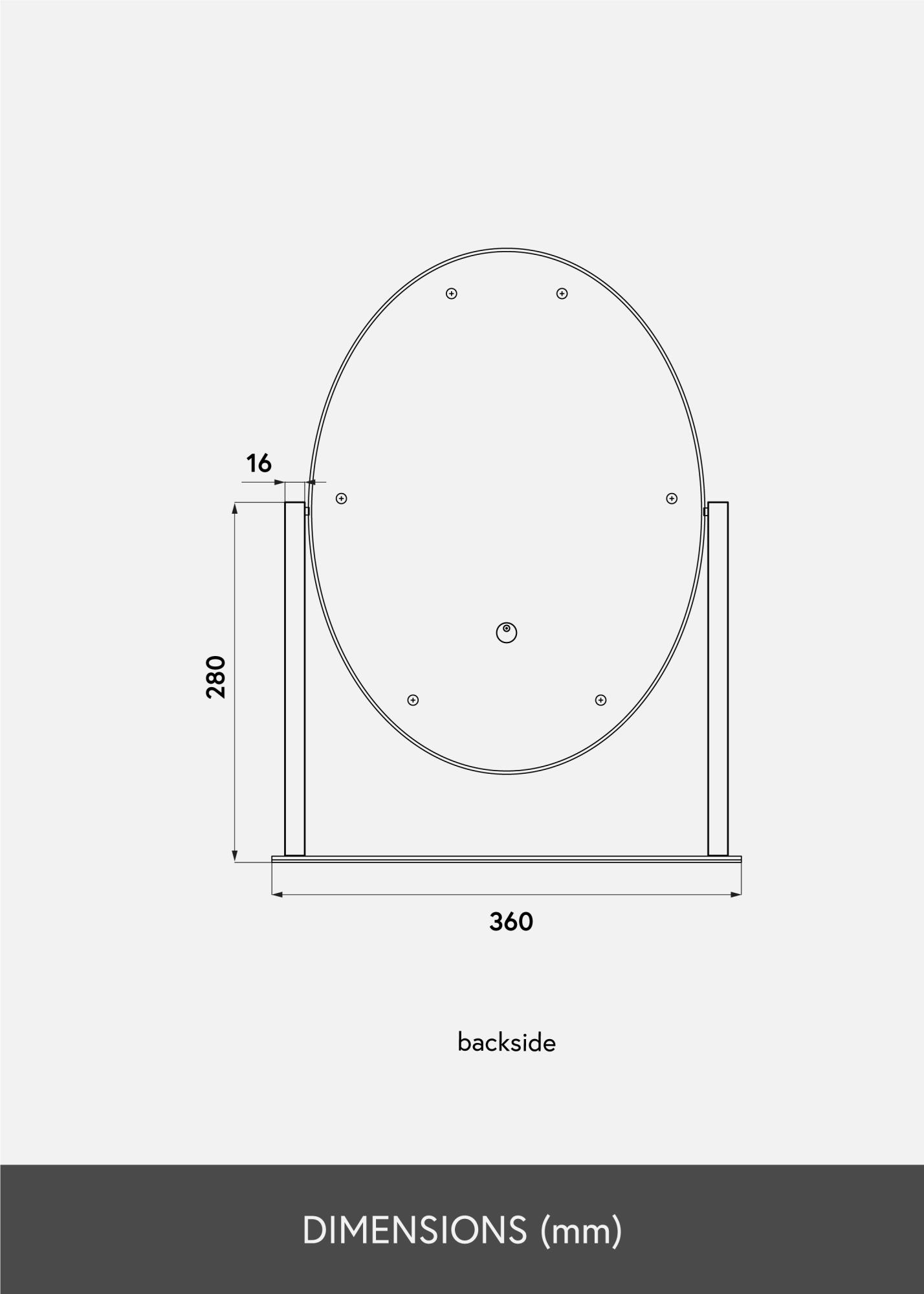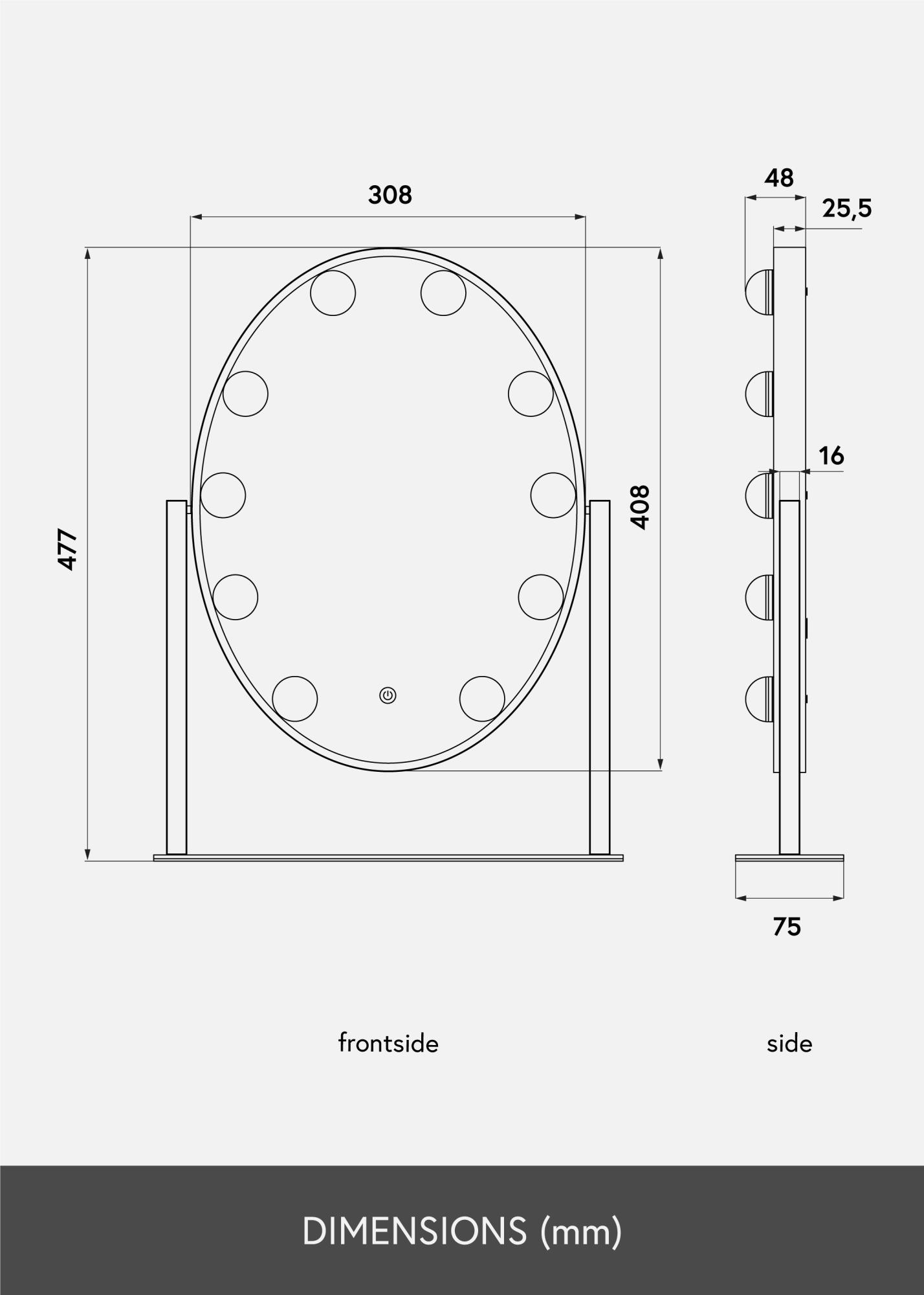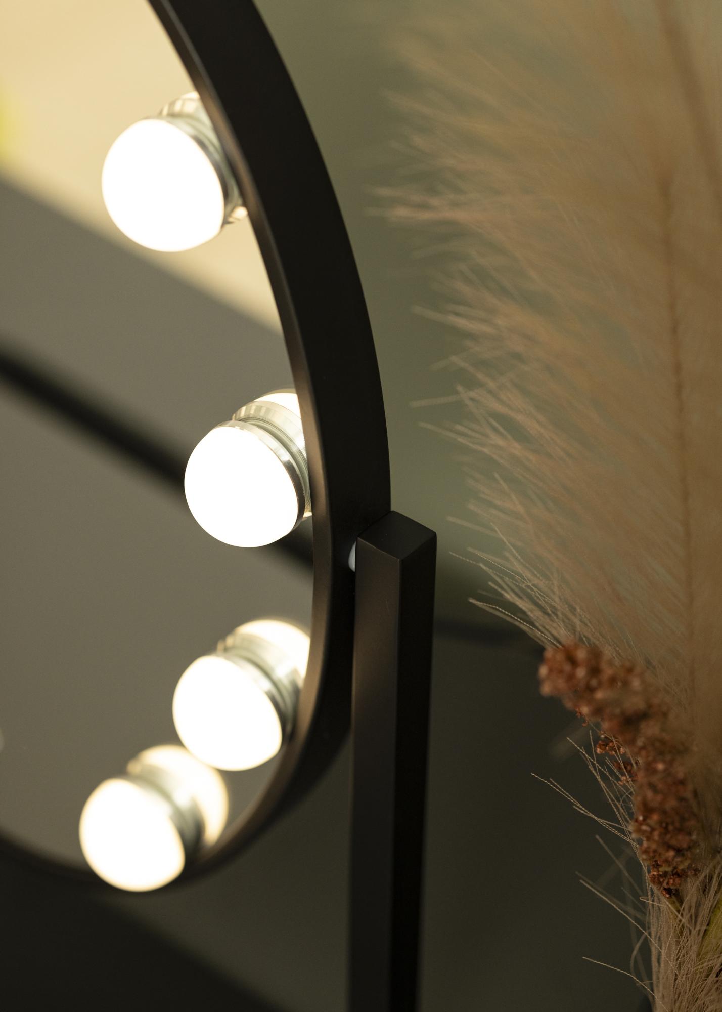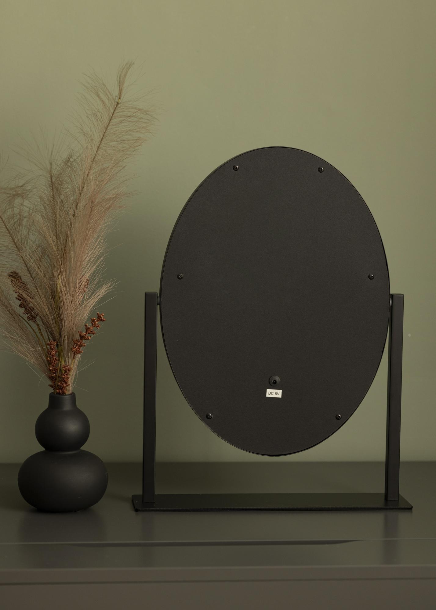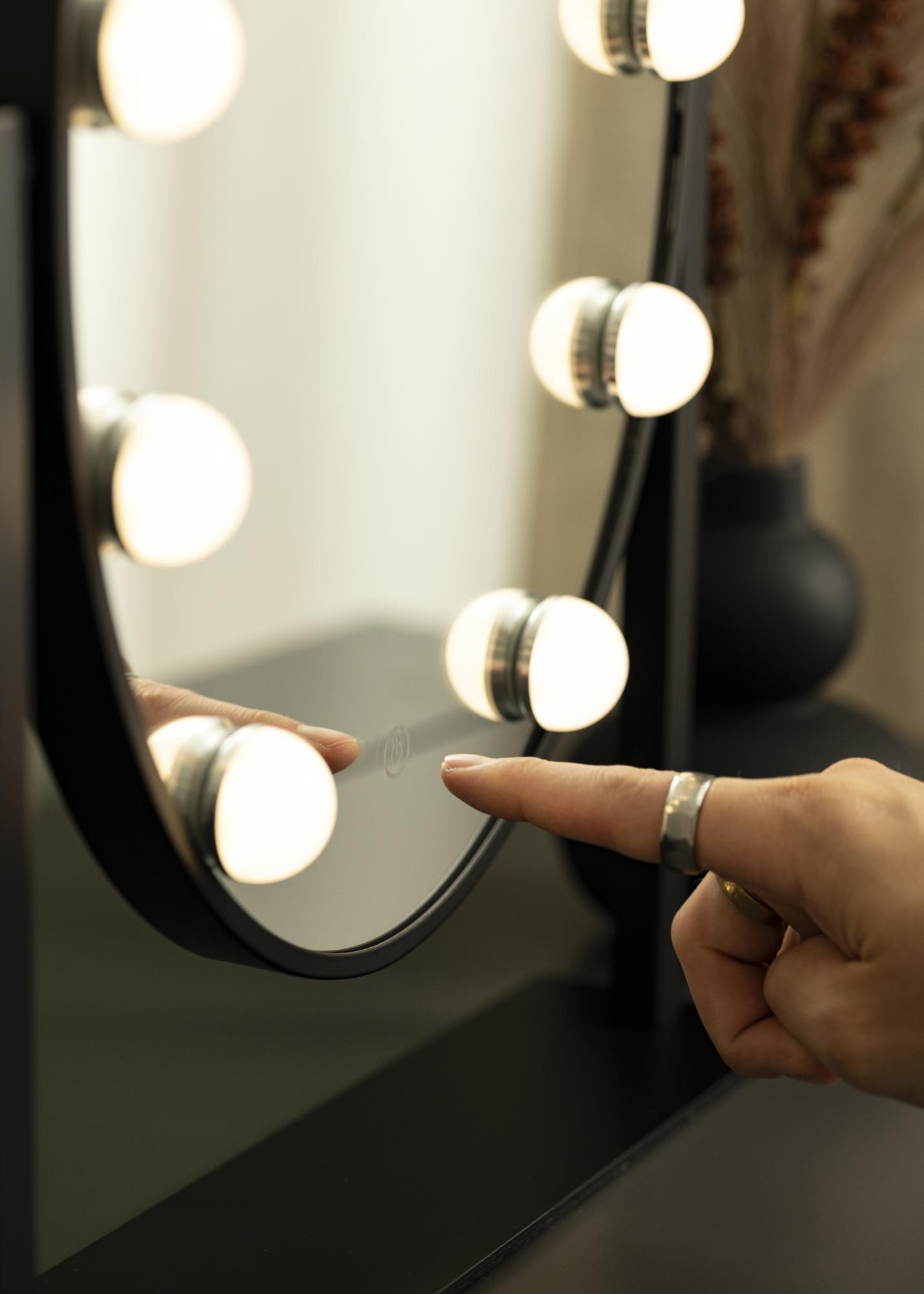 See on elegantse ovaalse kujuga meigipeegel Rootsi kaubamärgilt KAILA. Meigipeegel on stiilse musta disainiga ja sellel on integreeritud hämardatav LED valgustus. LED valgustus koosneb 10 lambist, mis annavad ühtlase ja sooja valge tooni 3000K. Valgustus süttib, kui vajutate puutetundlikule nupule, ja valgustugevust saab lihtsasti reguleerida, hoides nuppu paar sekundit all. LED on energiasäästlik valgusallikas loomuliku valgusega, mis sobib ideaalselt meigi pealekandmiseks. Meigipeegli mõõdud on 34x47 cm ja seda saab pöörata 360° vertikaalselt, mis võimaldab end hõlpsasti peegeldada erinevates nurkades. Ajatu ja glamuurse disainiga luuakse teie kodus Hollywoodi tunne!