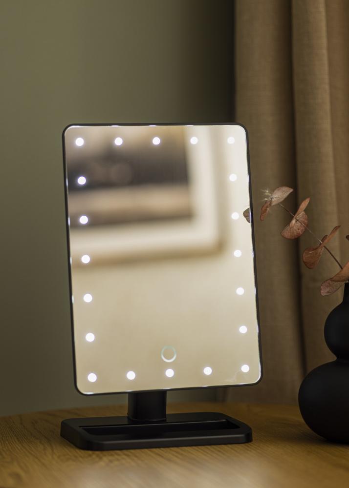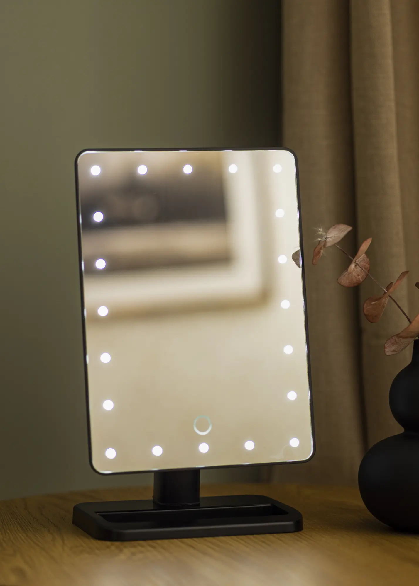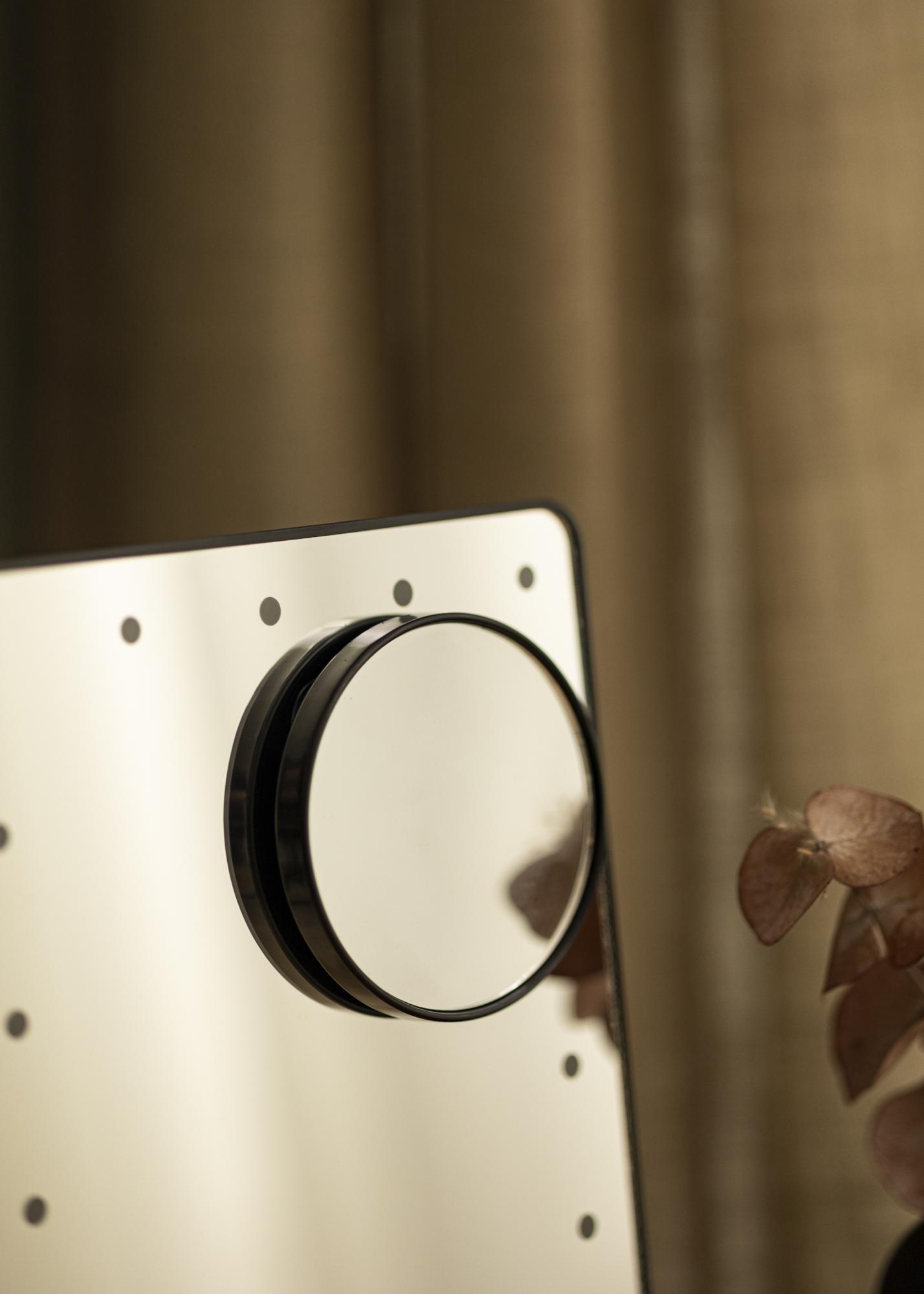 Peeglil on nutikas disain, millel on hämarusega LED-valgustus, mis annab külma valget valgust. Valgustust saate sisse ja välja lülitada tagaküljel oleva nupuga. Et teil oleks võimalik ennast korralikult peegeldada, on see meigipeegel ka pööratav ja kaldenurk reguleeritav, nii et saate peeglilaua asendit soovitud viisil korrigeerida. Kaasas on väiksem peegel 2x ja 3x suurendusega, mida saab hõlpsasti kinnitada peaspeegli peegelpinna külge. Peeglil on sisseehitatud liitiumioonaku, mis laaditakse USB-ühenduse kaudu. Laadimiskaabel on komplektis.