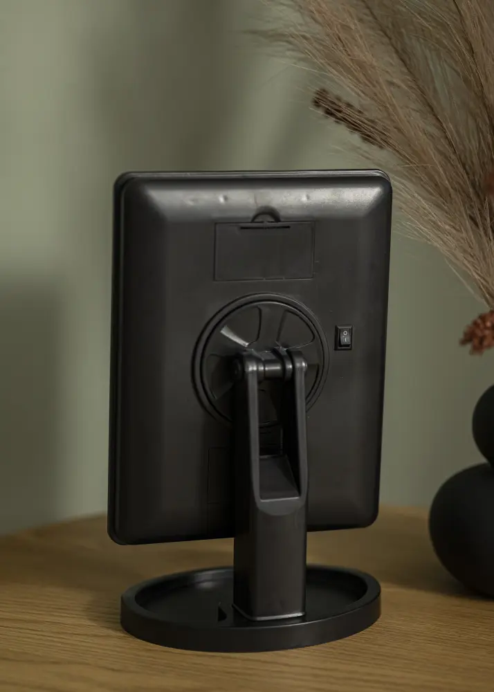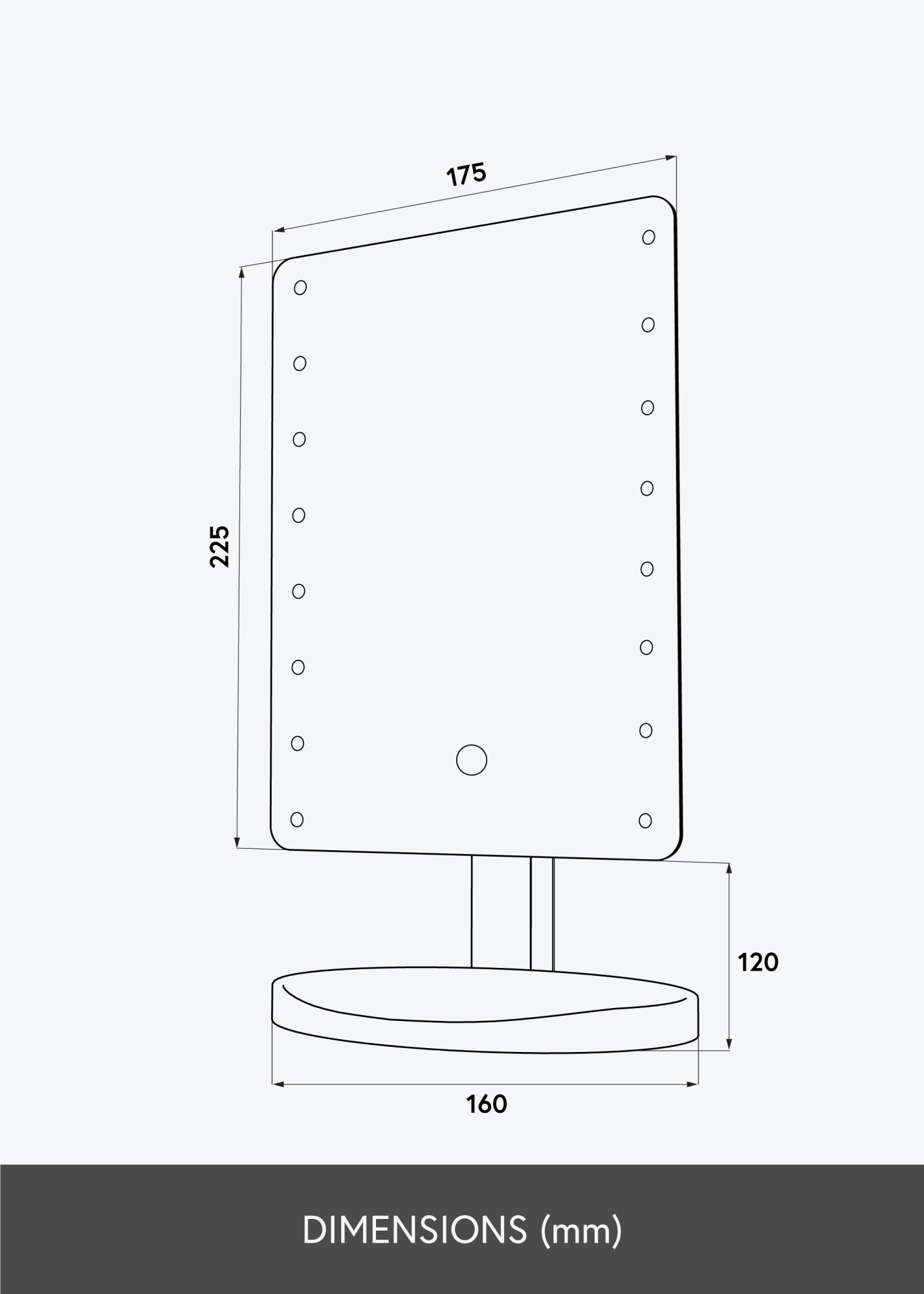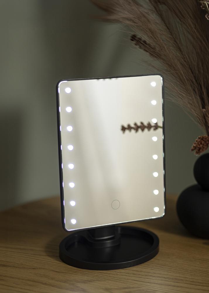 See on mugav meigipeegel jalal, varustatud integreeritud LED-valgustusega, mis raamib 17,5x22,5 cm suurust peegelduvat pinda. Stiilne disain neutraalse musta värviga muudab peegli kauniks sisustuselemendiks, mis sobib igasse ruumi. Peeglit saab kallutada, mis on ideaalne, kui soovite meiki kanda ja päevaks valmis olla. Portatiivne formaat muudab peegli ka lihtsasti kaasaskantavaks.