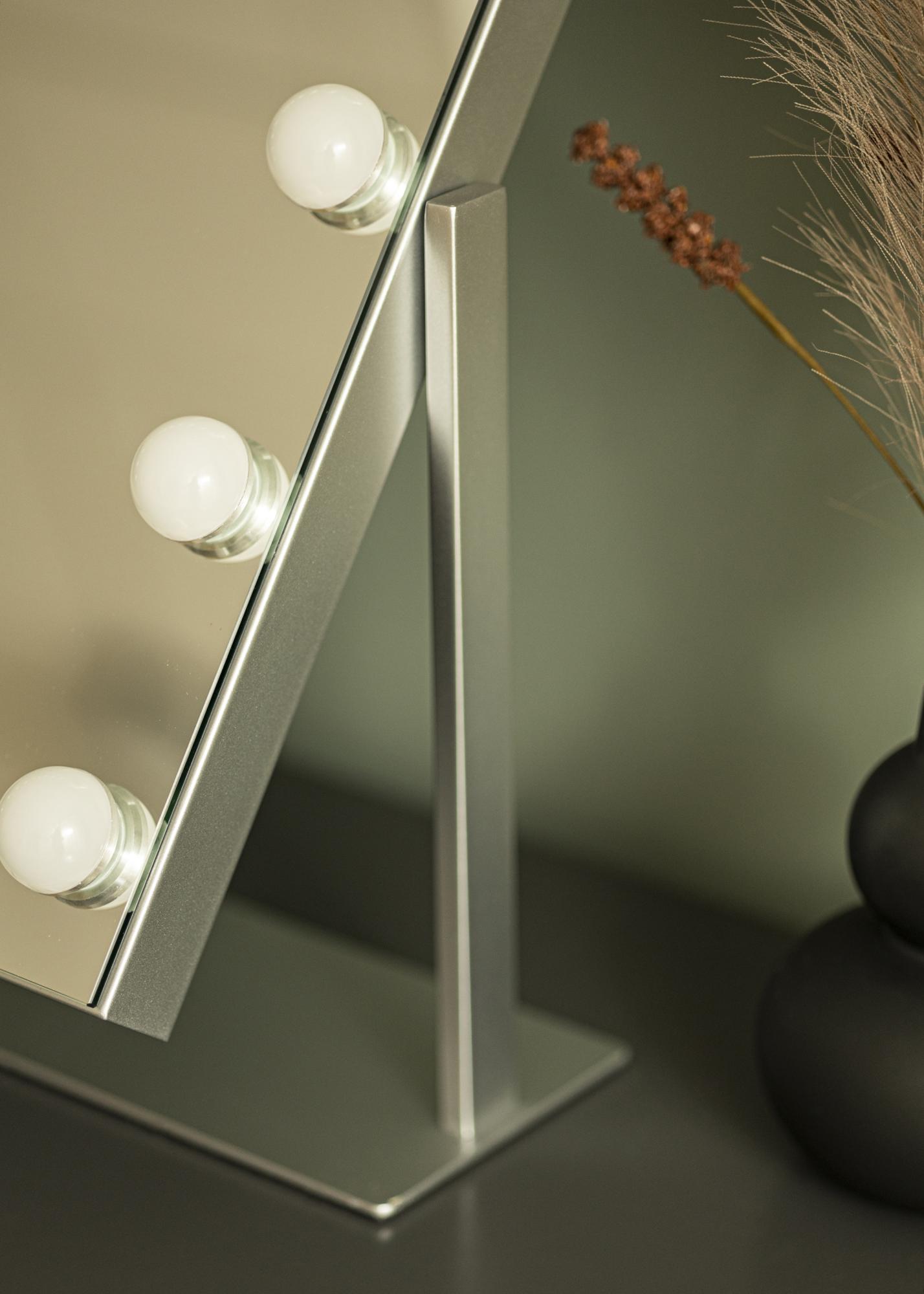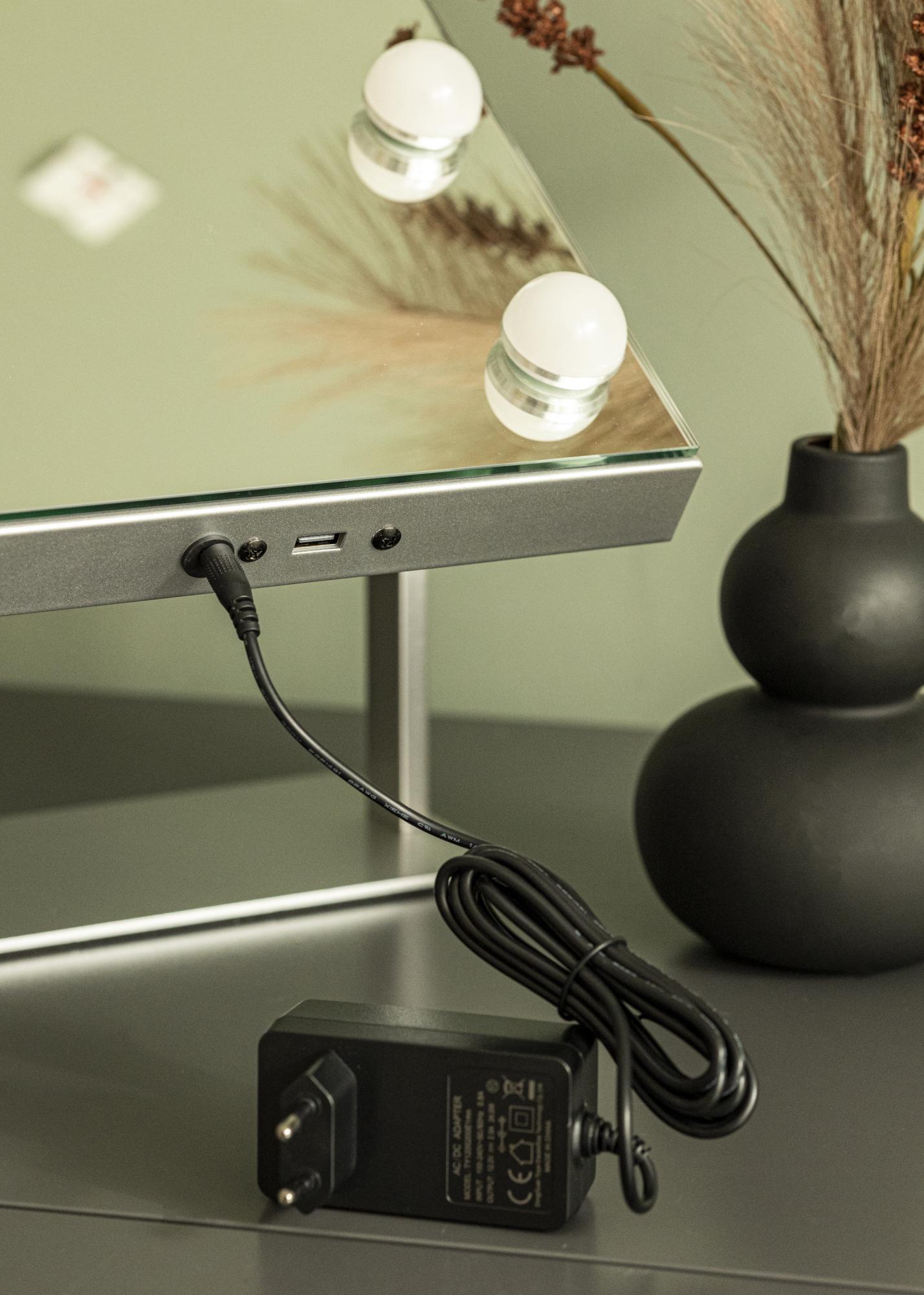 Sellel peeglil on hõbedane jalg, mis lisaks elegantsele välimusele võimaldab teil peeglipinda kallutada. Peegli alumisel serval on USB-pistik teie nutiseadmete laadimiseks.