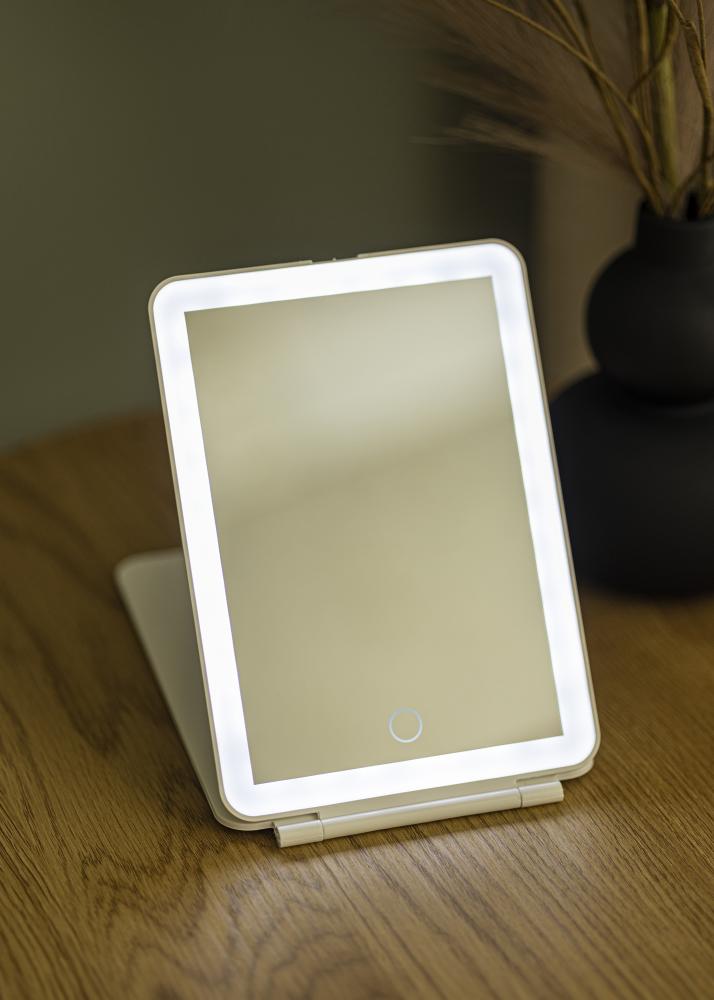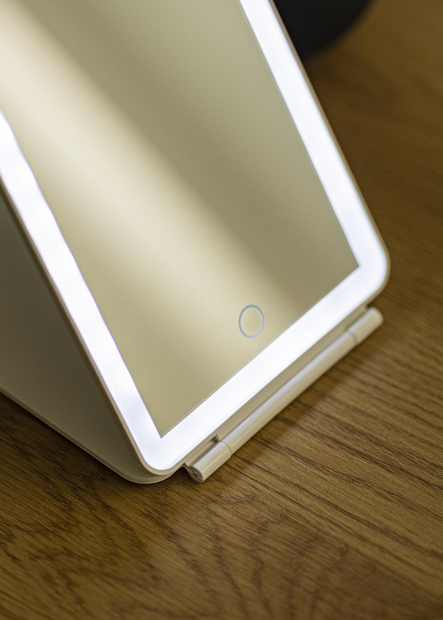 Tegemist on valge peegliga, millel on sisseehitatud LED-valgustus, mis annab sinu näole meeldiva kuma. See töötab patareidel ja laetav lihtsalt USB-ühenduse kaudu, kui aku hakkab tühjenema. Kaasas on laadimiskaabel. Peegel lülitatakse sisse puutetundliku nupuga peegelpinnal, mille abil saab ka valgustust reguleerida. Hoides nuppu paar sekundit all, saad nii valgust hämardada kui ka värvitemperatuuri seadistada.
