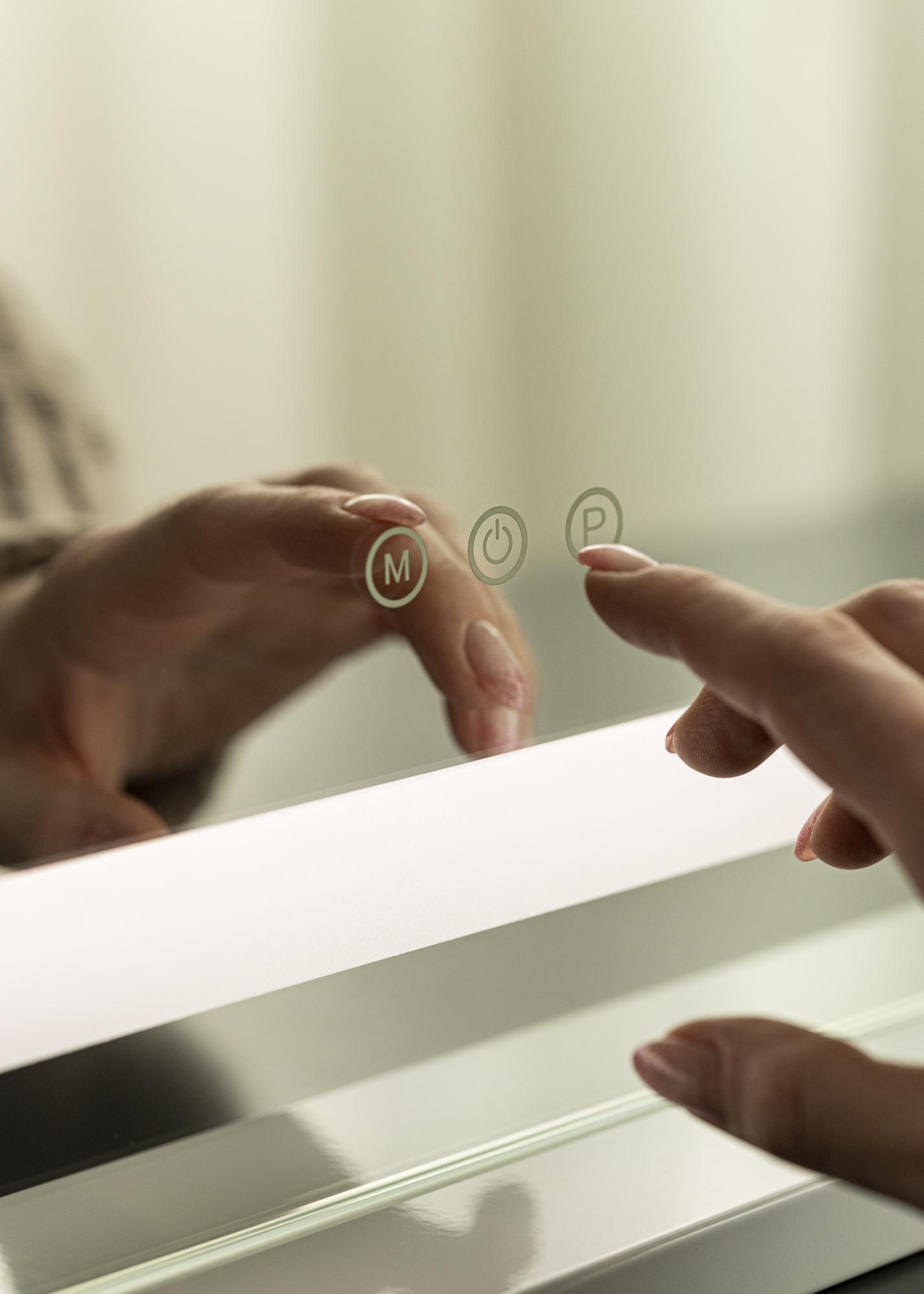 Peegel on varustatud täiustatud puutetundliku funktsiooniga. Lihtsa puudutusega saad sisse lülitada ja reguleerida heledust ning muuta valguse värvitemperatuuri, kasutades esiküljel asuvaid märgitud "M"- ja "P"-nuppe. Seetõttu ei ühenda see meigipeegel ainult esteetikat praktilise kasutamisega, vaid on ka energiatõhus tänu oma LED-tehnoloogiale. Valgusallikad on disainitud kestma kogu toote elutsükli jooksul, säilitades oma algsest heledusest hinnanguliselt 50% isegi pärast 50 000 tundi, muutes selle peegli iga kodu jaoks vastupidavaks ja usaldusväärseks valikuks.