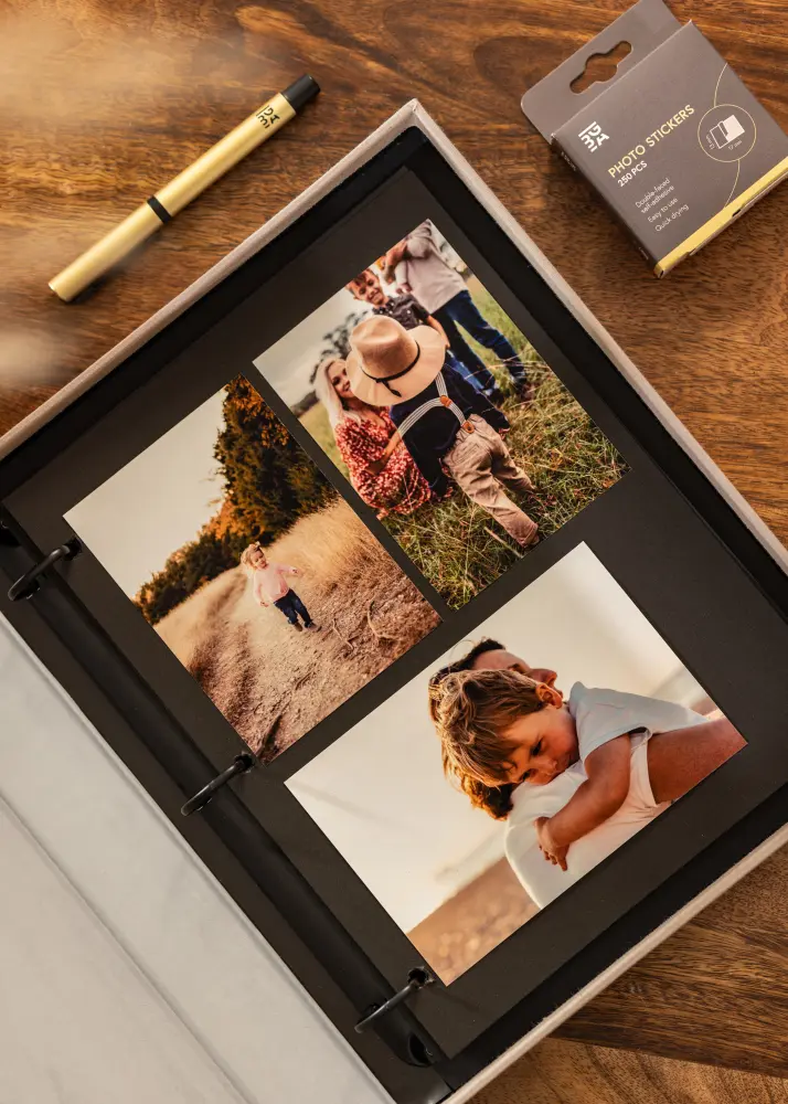 Fotoalbum on kujundatud eksklusiivse kastina, mille avad, et saada ligi sisule. Albumi sees on rõngasköide ja 30 musta lehte (60 lehekülge), mida täita oma lemmikmälestustega. Sa kleebid ise oma fotod sisse, mis annab sulle suure paindlikkuse ja võimaluse välja tuua oma loominguline külg.