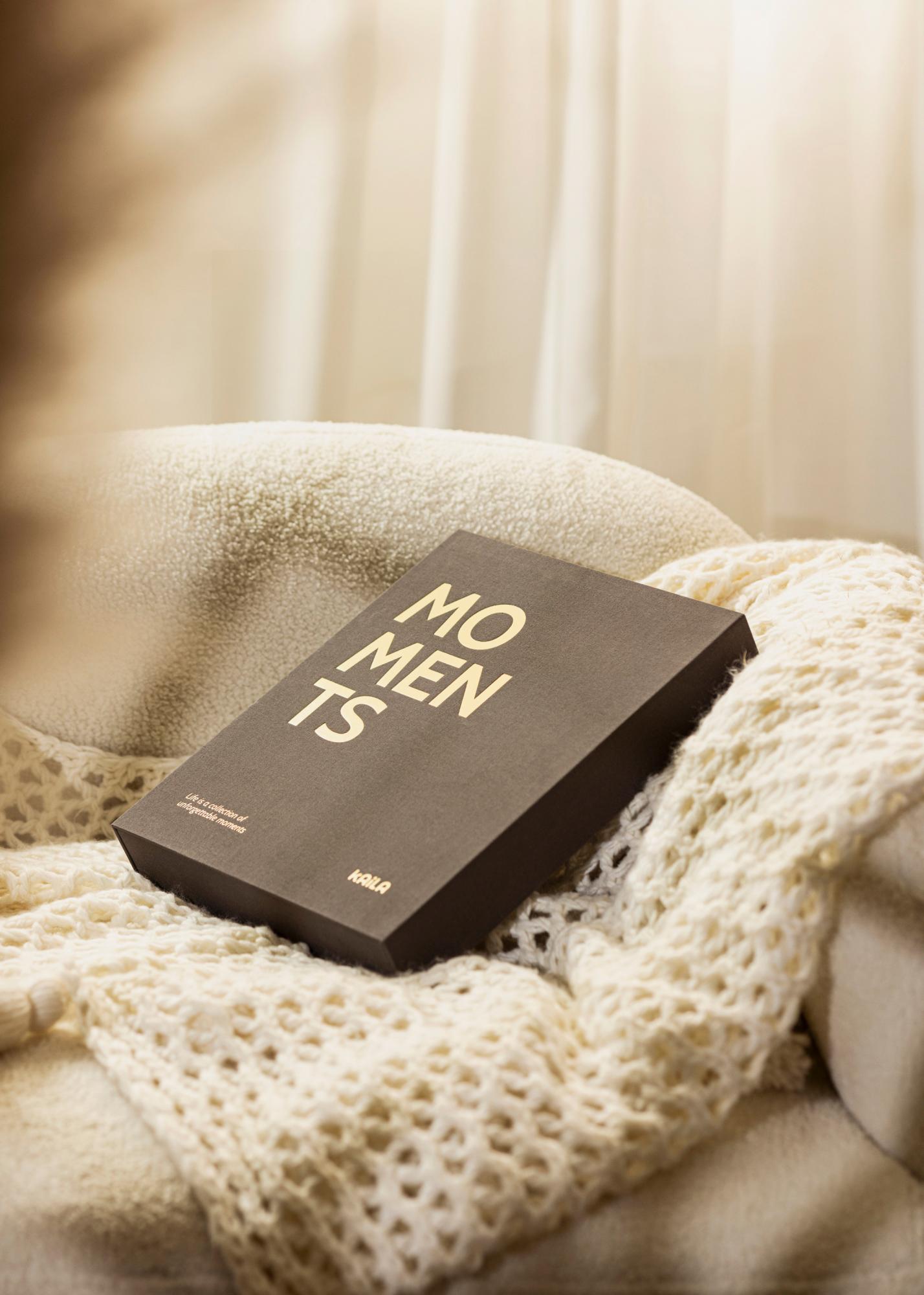 Fotoalbum on kujundatud nagu karp, mida saab avada, et pääseda fotodele ligi. Kaas on kaunistatud musta tekstiiliga, mis annab luksusliku tunde. Esiküljel ja lühikesel küljel on tekst "MOMENTS". Ülemisel vasakus nurgas on ilus alapealkiri "Life is a collection of unforgettable moments".