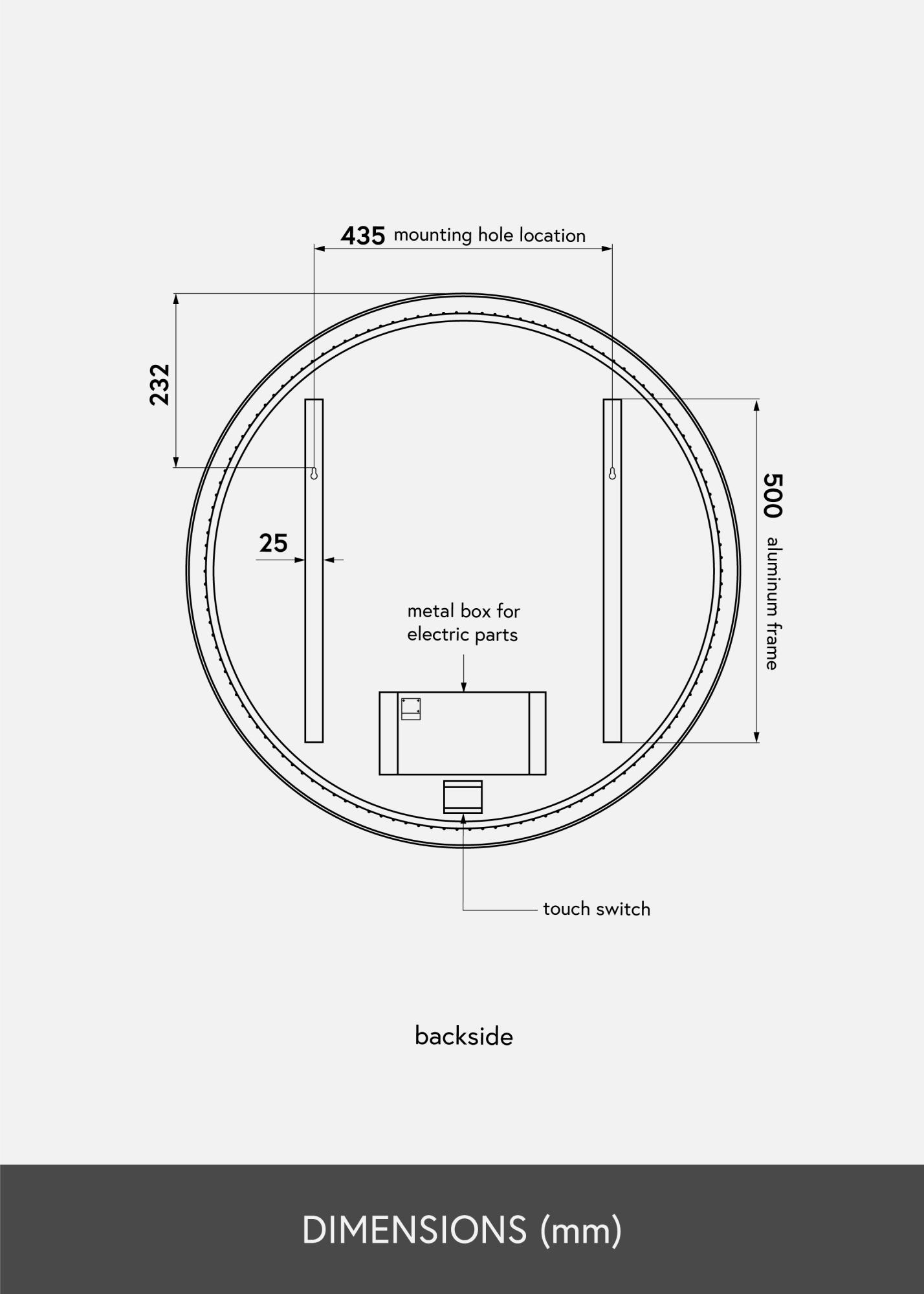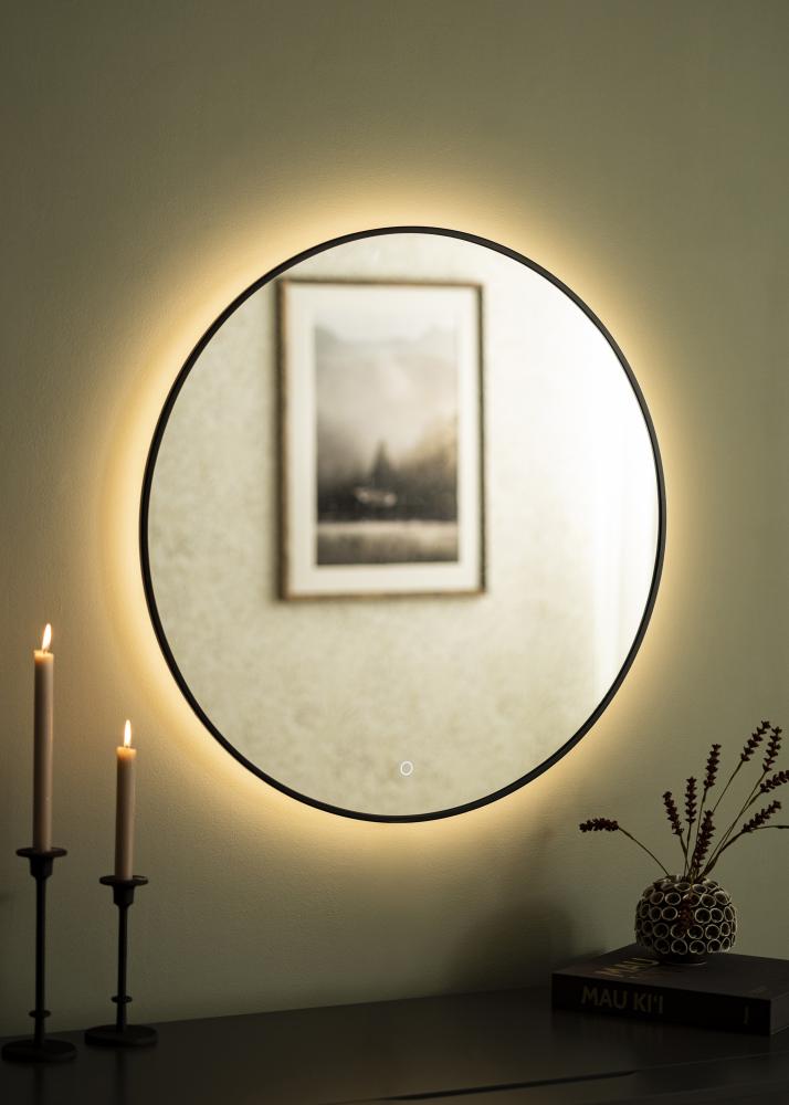 See on stiilne LED-valgustusega peegel, mis näeb ilus välja nii esikus kui ka vannitoas. Peegli klassikaline ümmargune kuju ja metallsõrmus on rafineeritud musta värvi. Peegli integreeritud LED-valgustust 3000K saab hämardada vahemikus 10%-100% valguse tugevusest. See võimaldab teil lihtsalt seadistada valgust soovitud valguse intensiivsusele ja muuta seda, kui teie vajadused peaksid muutuma. Valguse hämardamiseks hoidke mõne sekundi jooksul puudutusnuppu peegli alumises osas. LED-valgustus on asetatud peegli tagaküljele, mis annab valgusele pehmema tooni.