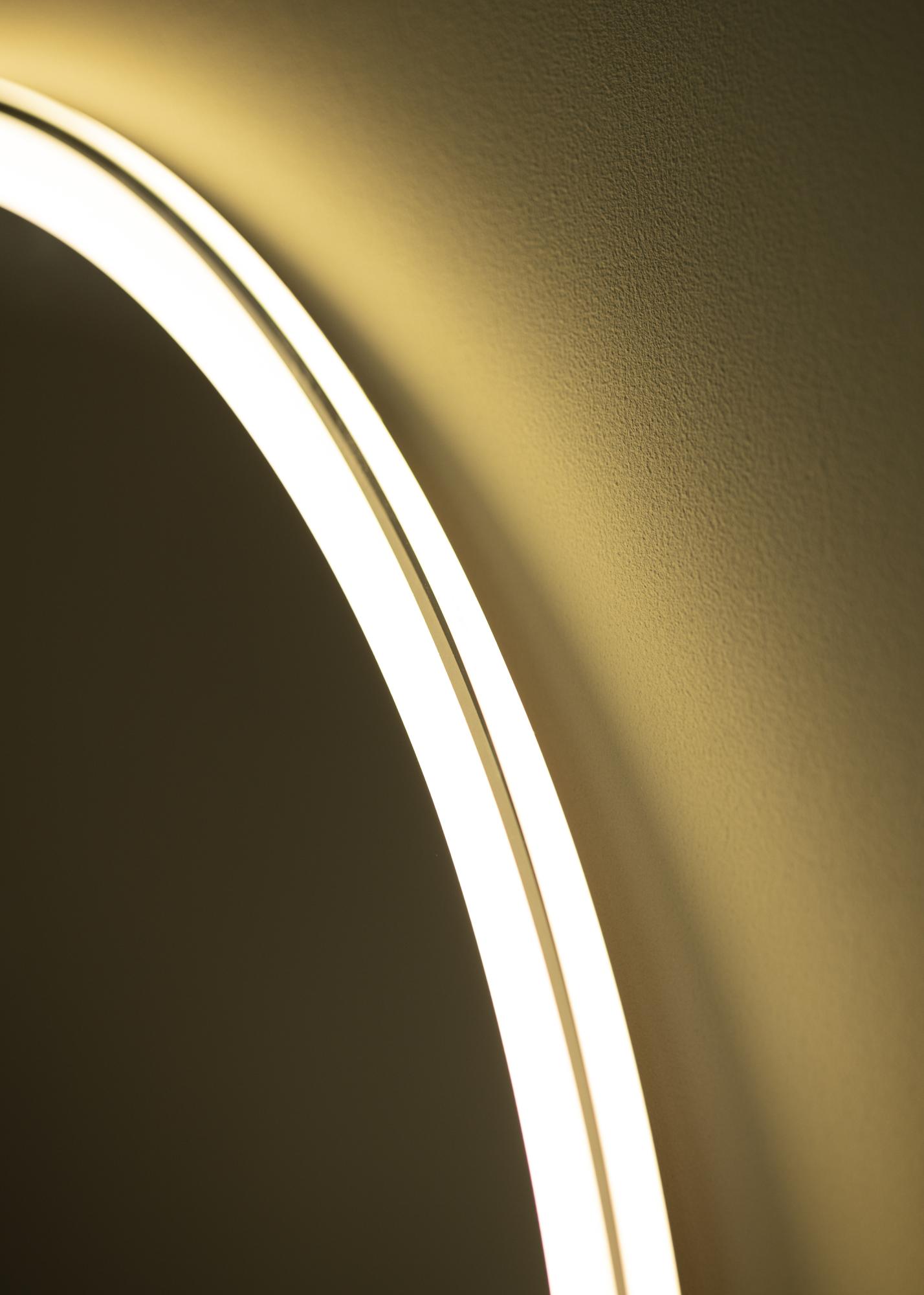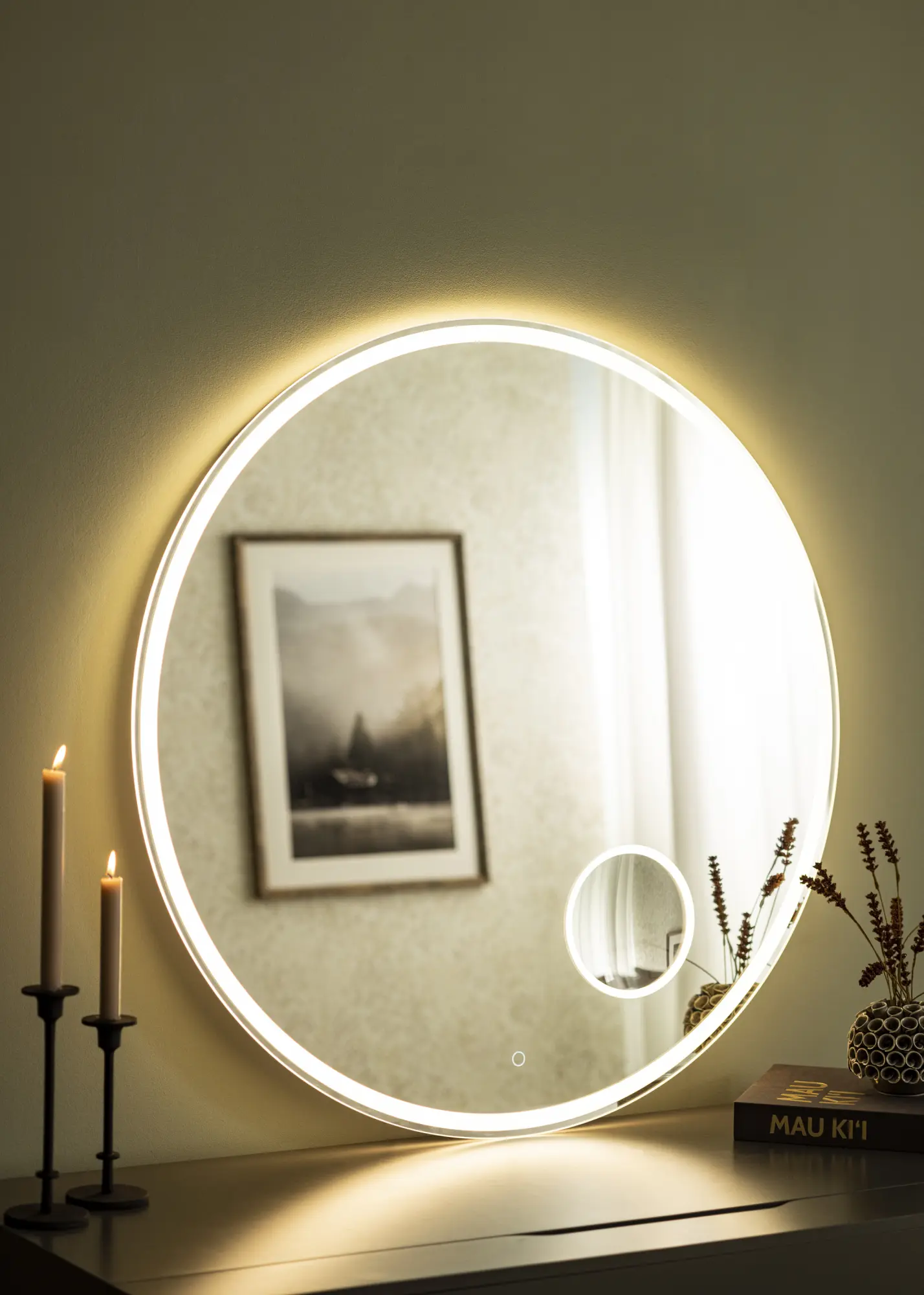 Kas otsite stiilset vannitoapeeglit, millel on sisseehitatud LED-valgustus ja suum? Siis on see peegel just teie jaoks! Peegel on klassikalise ümmarguse kujuga ja peegelpinna servades on LED-riba. See on varustatud tavalise peegliklaasiga ja sellel on väiksem peegel, millel on 3-kordne suum ja millel on ka LED-valgustus, mis raamib peegelpinda. Valgus on meeldiva valgusega 3000K, mida saate hõlpsasti hämardada vahemikus 10-100% valgusvõimsusest. Valgustugevuse reguleerimiseks hoidke puudutamise nuppu peegli alumises servas paar sekundit all.