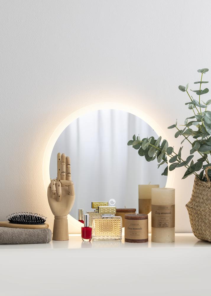 See on klassikaline ja stiilne ümmargune vannitoapeegel. Peegel on raamitud matt servaga, millel on integreeritud LED valgustus. Valgustus süttib peegli taga ja annab ette meeldiva sooja valge valguse 3000K. Valgustus on hämardatav ja valgustuse tugevust saab hõlpsasti reguleerida, hoides nuppu all paar sekundit. Järgmine kord valgustust sisse lülitades mäletab peegel, millise valgusjõuga see oli seadistatud. Peegliga on kaasas seinakinnitused ja see on vannitoas kasutamiseks heaks kiidetud. Vannitoapeegel on ette nähtud püsivaks paigaldamiseks ja ühendatakse lülitiga. Peegel töötab korrektselt, kui see on ühendatud tavalise lülitiga, mitte hämarduslülitiga.