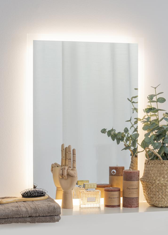 See stiilne Rootsi disainiga peegel KAILA-lt on ristkülikukujuline ja külgedelt matistatud. Stiilsete servade taga on peeglil integreeritud LED-valgustus, mis valgustab peegli kaunilt ja annab sooja valget valgust 3000K juures. Valgustus on hämardatav ja te reguleerite hõlpsasti tugevust, hoides puudutusnuppu ekraanil mõne sekundi. Kosmeetikapeegel mäletab automaatselt viimast valgustusseadistust järgmisel korral, kui selle sisse lülitate. LED on energiasäästlik valgusallikas, mis annab ühtlast ja loomulikku valgust.