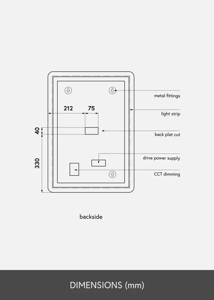 Elegantne vannitoapeegel on vaid 3 cm sügav ja mõõtudega 50x70 cm. Vannitoapeeglil on seinakinnitused ja seda saab paigaldada nii horisontaalselt kui ka vertikaalselt. Hämardatav LED-valgustus ja pehmed servad annavad peeglile sooja ja pehme tunde ruumis, kuhu see paigutatakse. Peegel on heakskiidetud kasutamiseks vannitoas. Vannitoapeegel on ette nähtud püsipaigalduseks ja ühendatakse voolulülitiga. Peegli korrektseks toimimiseks tuleb see ühendada tavalise voolulülitiga, mitte hämardiga.