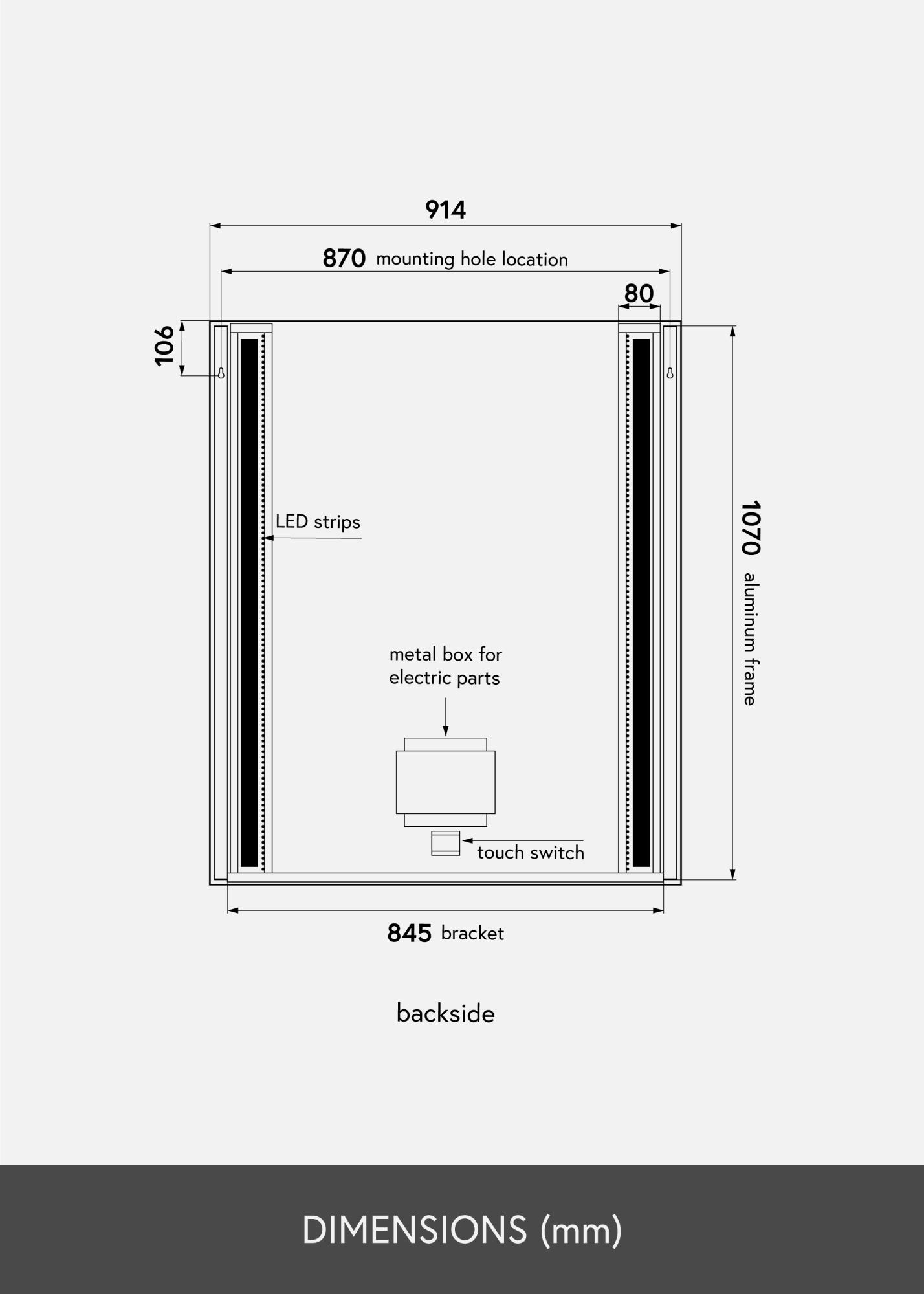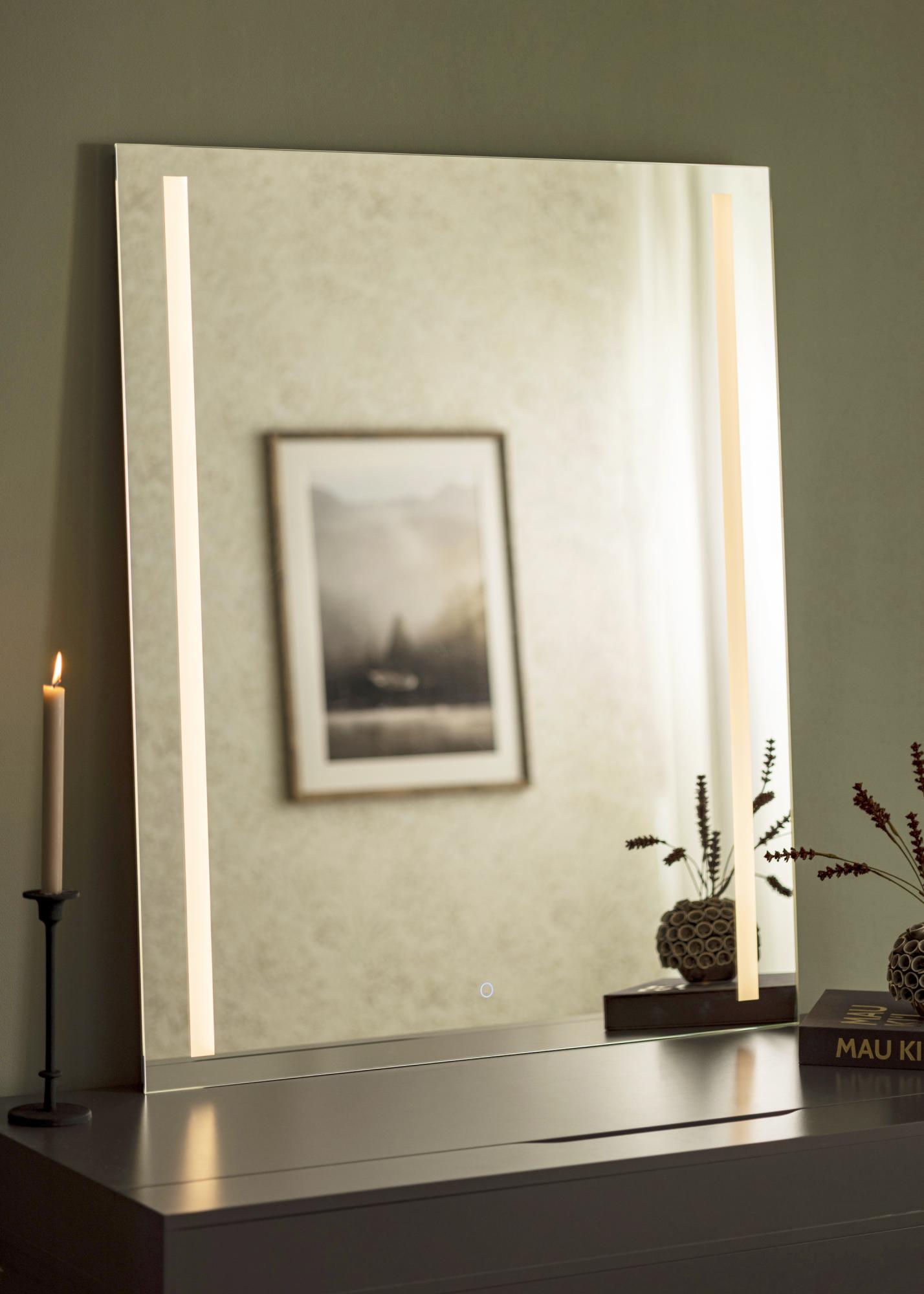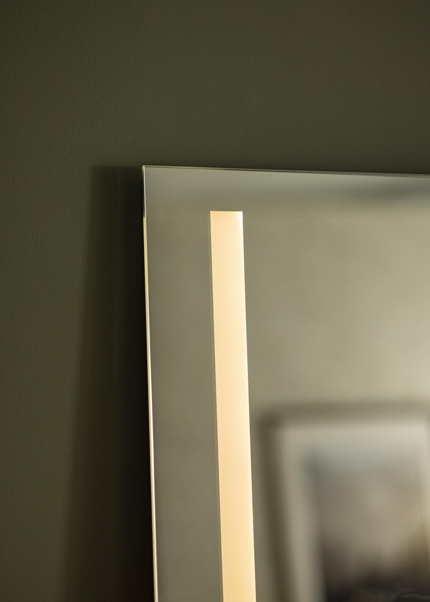 See on elegantne vannitoapeegel valgustusega ja klassikalise ristkülikukujulise vormiga. Valgustus koosneb kahest LED-ribast, mis asetsevad veidi peegelalal. See annab stiilse minimalistliku ilme, mis sobib suurepäraselt vannituppa. LED-valgustus annab meeldiva valguse 3000K juures ja teie mugavuse huvides saate valgustust hõlpsalt hämardada, hoides all puutenuppu peegli alumisel serval. Seeläbi saate reguleerida valguse tugevust vahemikus 10-100%. Peegel on mõeldud püsipaigalduseks ja ühendatakse lülitiga. Peegli korrektseks toimimiseks tuleb see ühendada tavalise lülitiga, mitte hämarlülitiga.