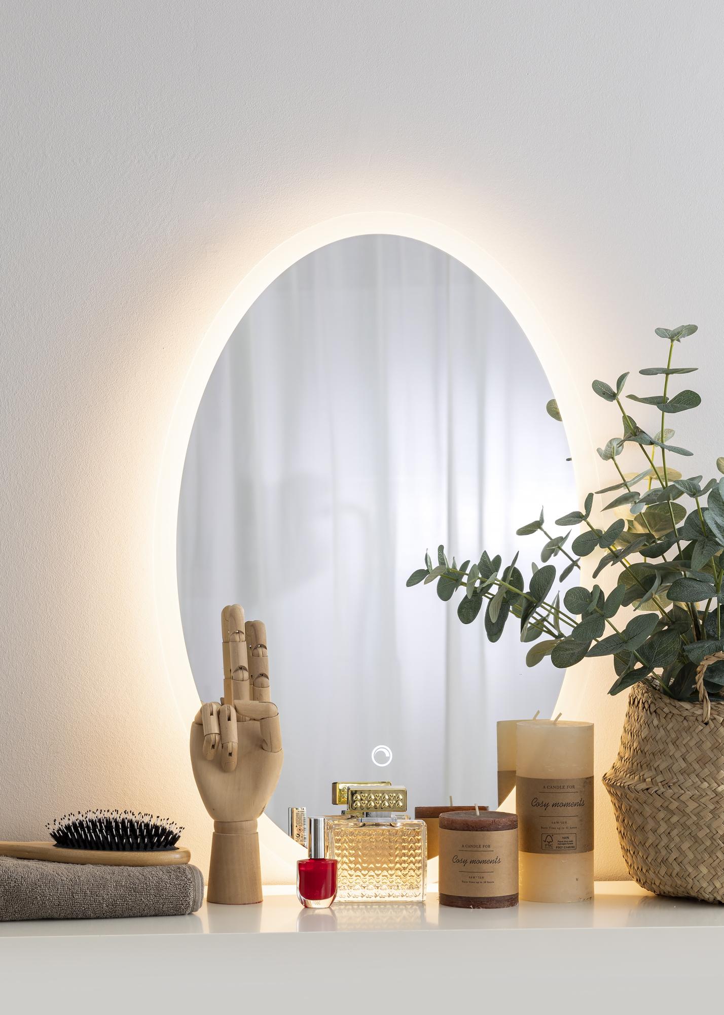 See on tõesti elegantse disainiga vannitoa peegel oma ovaalse kuju ja integreeritud LED valgustusega! Integreeritud LED valgustus on reguleeritav ja tugevust saab hõlpsalt reguleerida, puudutades ekraanil olevat veekindlat puutenuppu. Valgustus süttib sooja valge tooniga 3000K peegli taga ja loob ilusa kumava valguse edasi. LED on energiasäästlik valgusallikas, mis annab ühtlase ja loomuliku valguse. Peegel on heaks kiidetud vannituppa. Vannitoa peegel on mõeldud statsionaarseks paigaldamiseks ja ühendatakse toitelülitiga. Peegel töötab korrektselt, kui see on ühendatud tavalise toitelülitiga, mitte dimmerlülitiga.