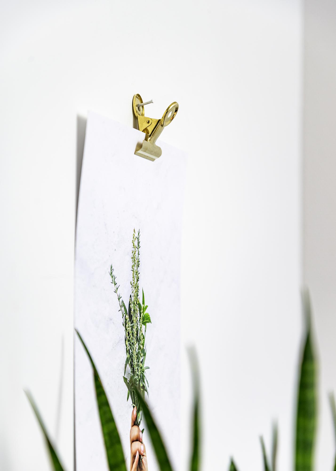 Metallklamber elegantse ja läikiva kullaviimistlusega, mis annab teie posteritele ja printidele trendika ja minimalistliku riputuslahenduse. Postri klambri disain on stiilne ning klambri ümaras tipus olevad augud muudavad lihtsaks selle seinale kinnitamise väikese naela või kruviga. Klambri avamisel on kindel haare, mis võimaldab riputada isegi kõige õhemad paberilehed, olles samal ajal paindlik ja võimaldades erineva paksusega motiivide paigaldamist. Kui teil on suur poster, mida soovite üles riputada, kasutage parimaks tulemuseks kahte metallklambrit.