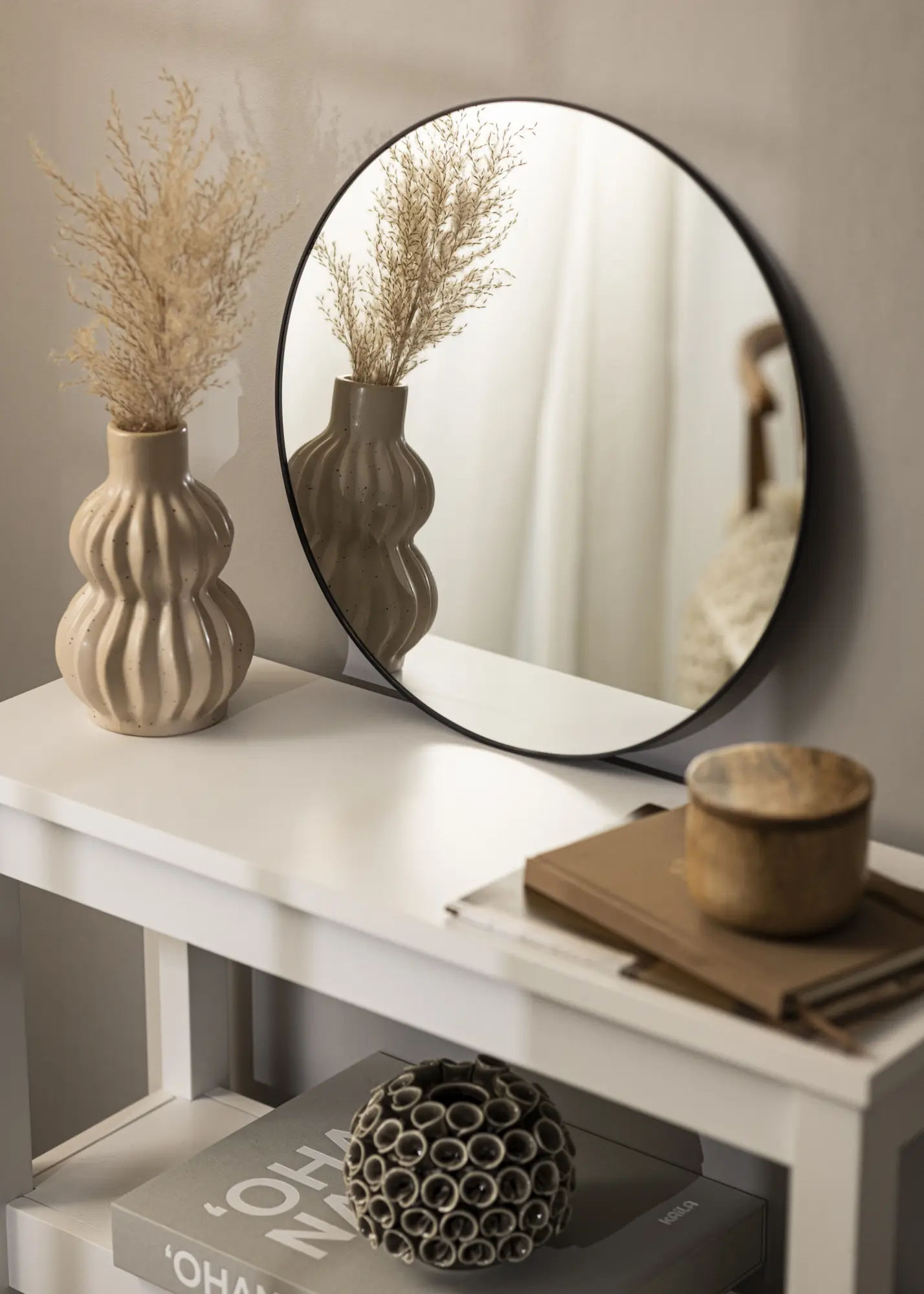 See ümmargune peegel on skandinaavia disain KAILA-lt ja on saadaval mitmes suuruses, millest see variant on 40 cm Ø. Peeglil on seinakinnitused.