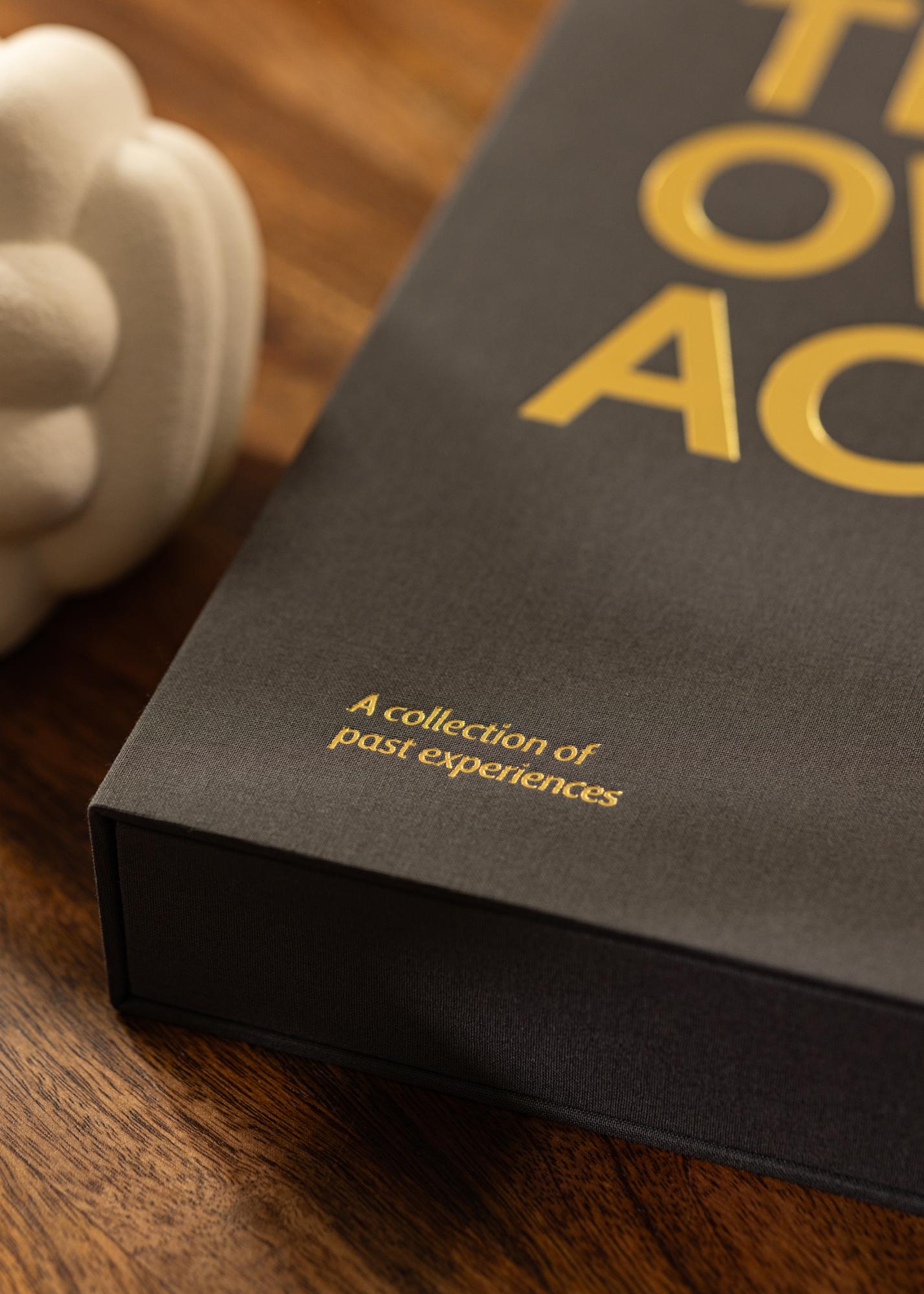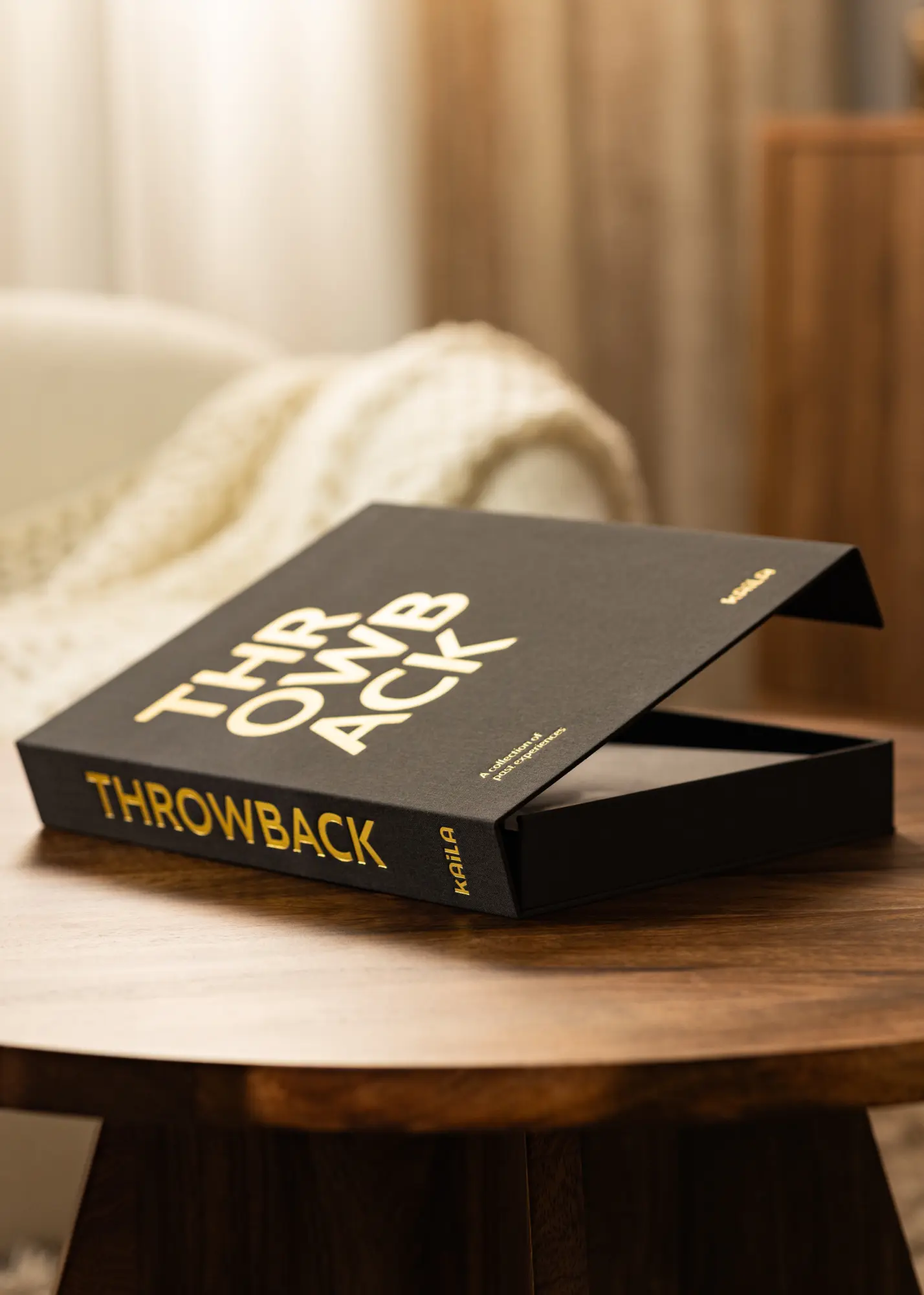 See on väga trendikas fotoalbum, mis on luksuslikult pakendatud stiilse Kohvilaua Raamatuna - nn Kohvilaua Fotoalbum. Fotoalbum on kujundatud eksklusiivse karbina, mille avate, et pääseda ligi sisule. Kaaned on elegantselt kaetud musta tekstiiliga ja kuldne trükk tekstiga "THROWBACK" kaunistab nii esikülge kui ka albumi selga. See tuttav väljend tagasivaateks annab fotoalbumile kaasaegse ja veidi kange tunde, kuna see tõesti eristub klassikalisest albumistiilist. Albumil on ka alapealkiri "A collection of past experiences", mis on trükitud vasakusse alumisse nurka.