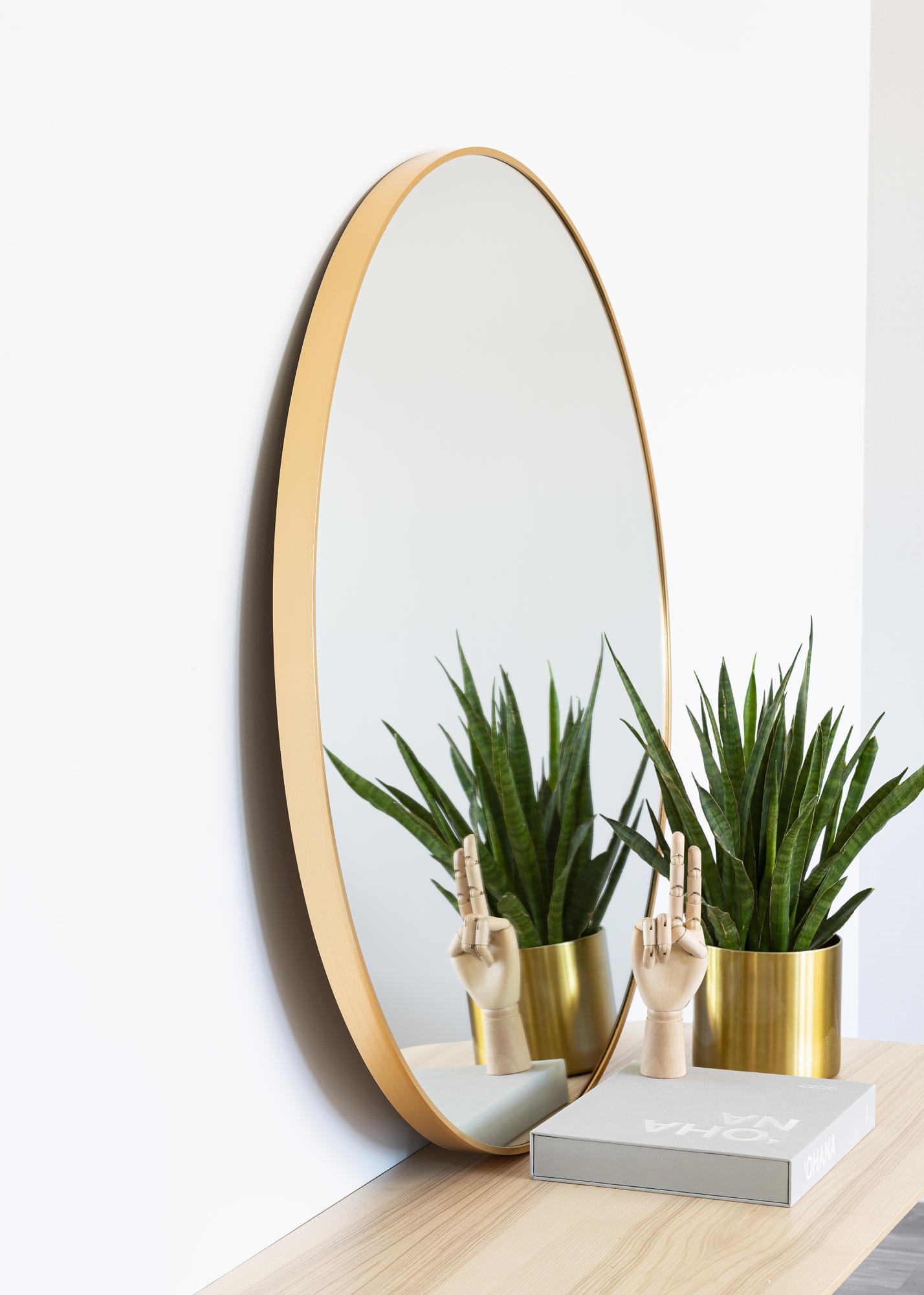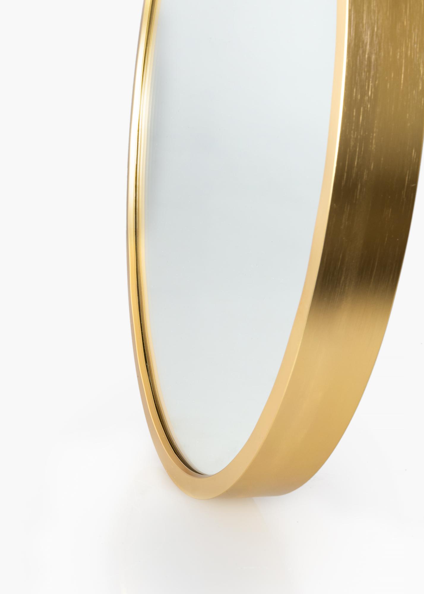 Ümmargune peegel stiilses Rootsi disainis kauni kullaviimistlusega metallraamiga. Raamil on harjatud pind, mis annab kaunile kuldsele värvile kergelt mattma välimuse. Raam on ka trendikalt õhuke, kuid samal ajal – sõltuvalt suurusest – on raam sügavusega 30-40 mm, mis tõstab selle seinast välja ja loob laheda 3D-efekti. Raami sügavus muudab peegli lisaks tugevaks ja vastupidavaks, samas kui see ei kaota peegli minimalistlikku tunnetust.