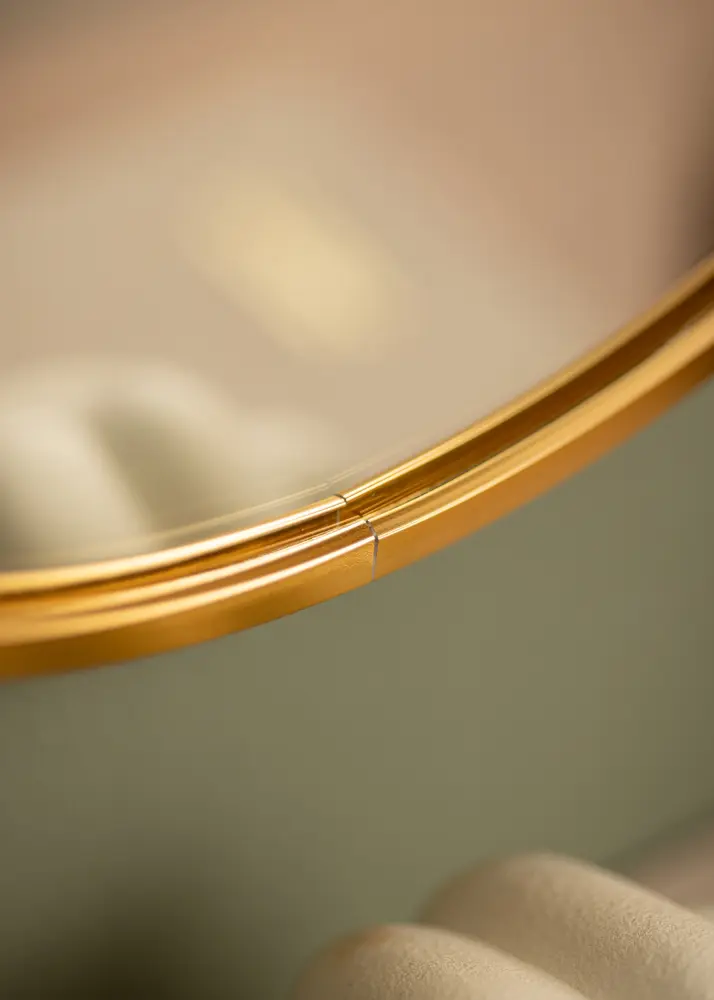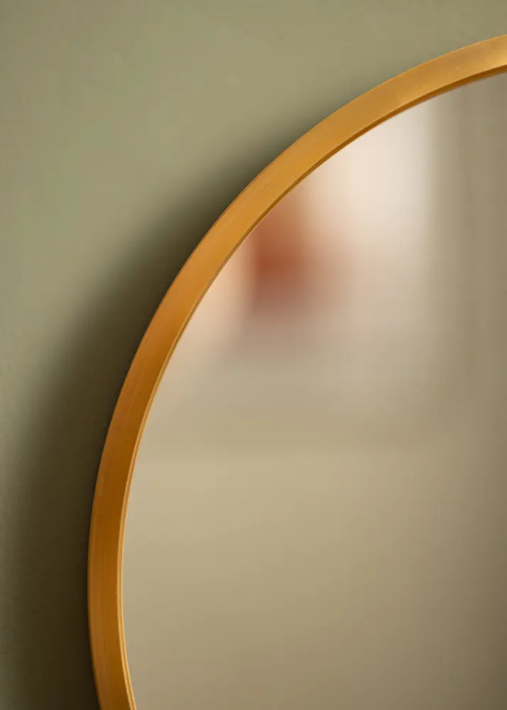 Ümar peegel stiilses Rootsi disainis metallraamiga, millel on kaunis kuldviimistlus. Raamil on harjatud pind, mis annab kaunile kuldsele värvile veidi matima ilme. Raam on samuti trendikalt õhuke, kuid samal ajal – sõltuvalt suurusest – on sügavuseks 30-40 mm, mis tähendab, et see ulatub seinast eemale ja loob põneva 3D-efekti. Raami sügavus muudab peegli tundlikuks ja tugevaks, ilma et see hävitaks peegli minimalistlikku tunnetust.
