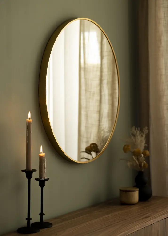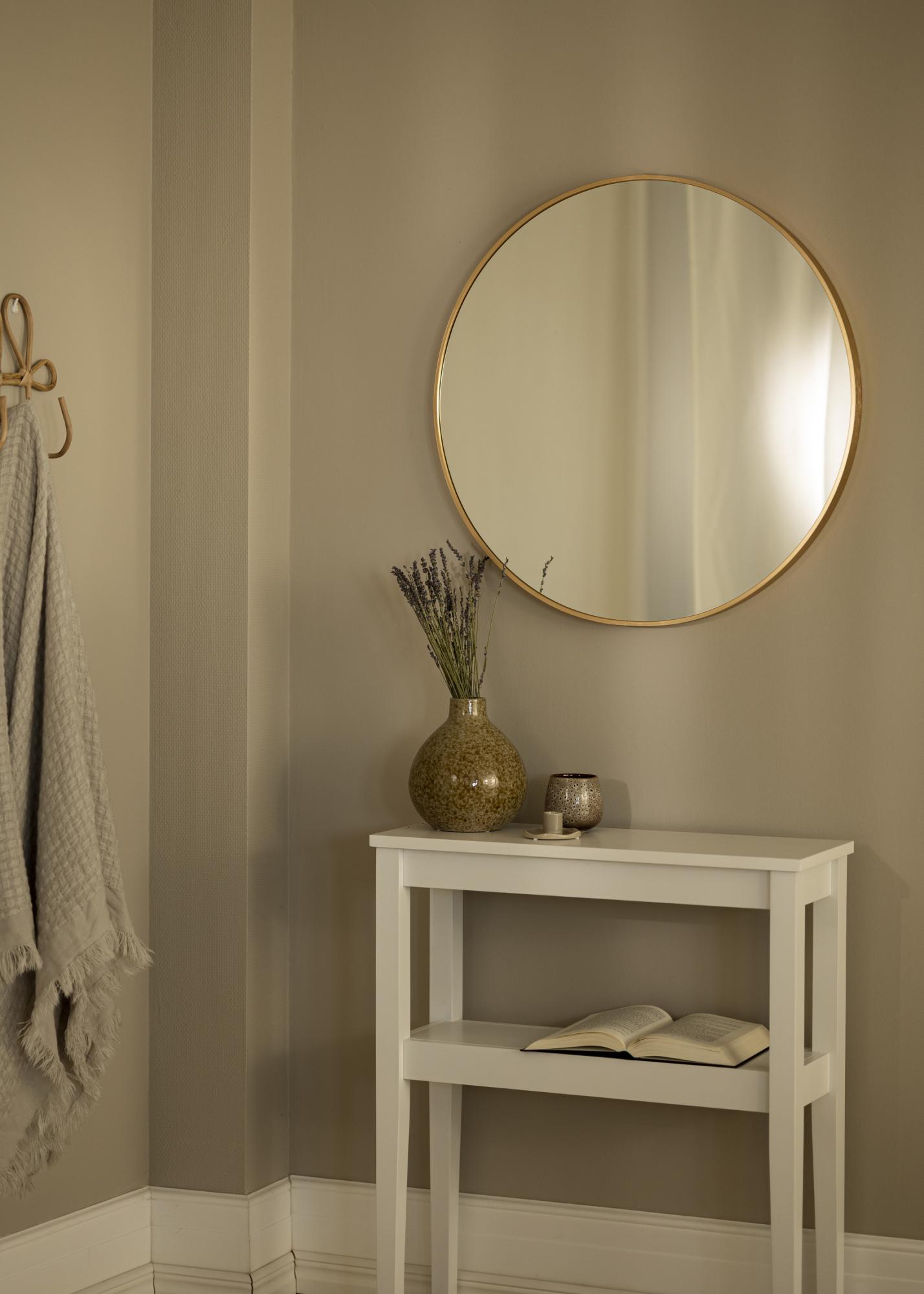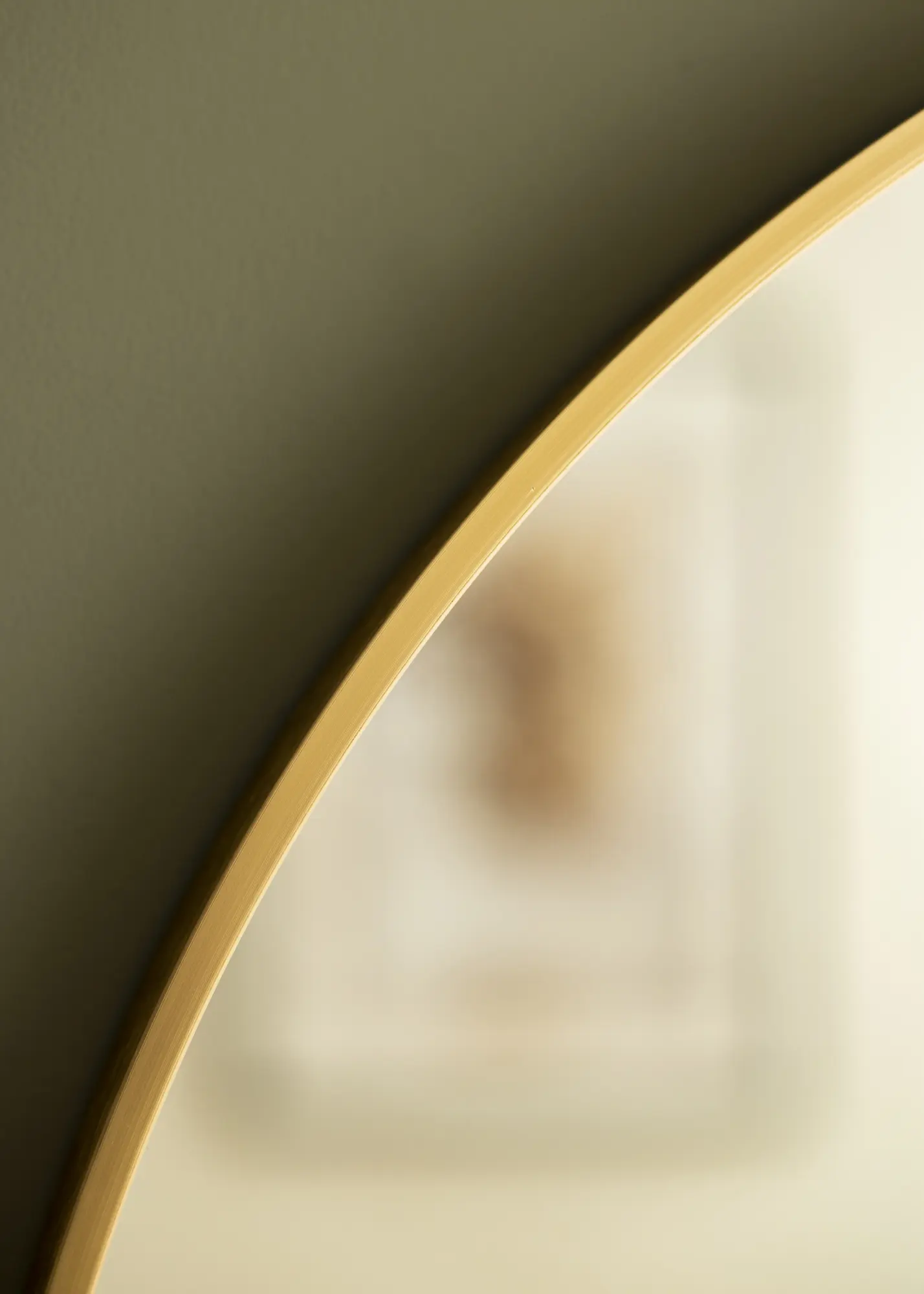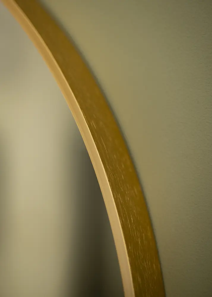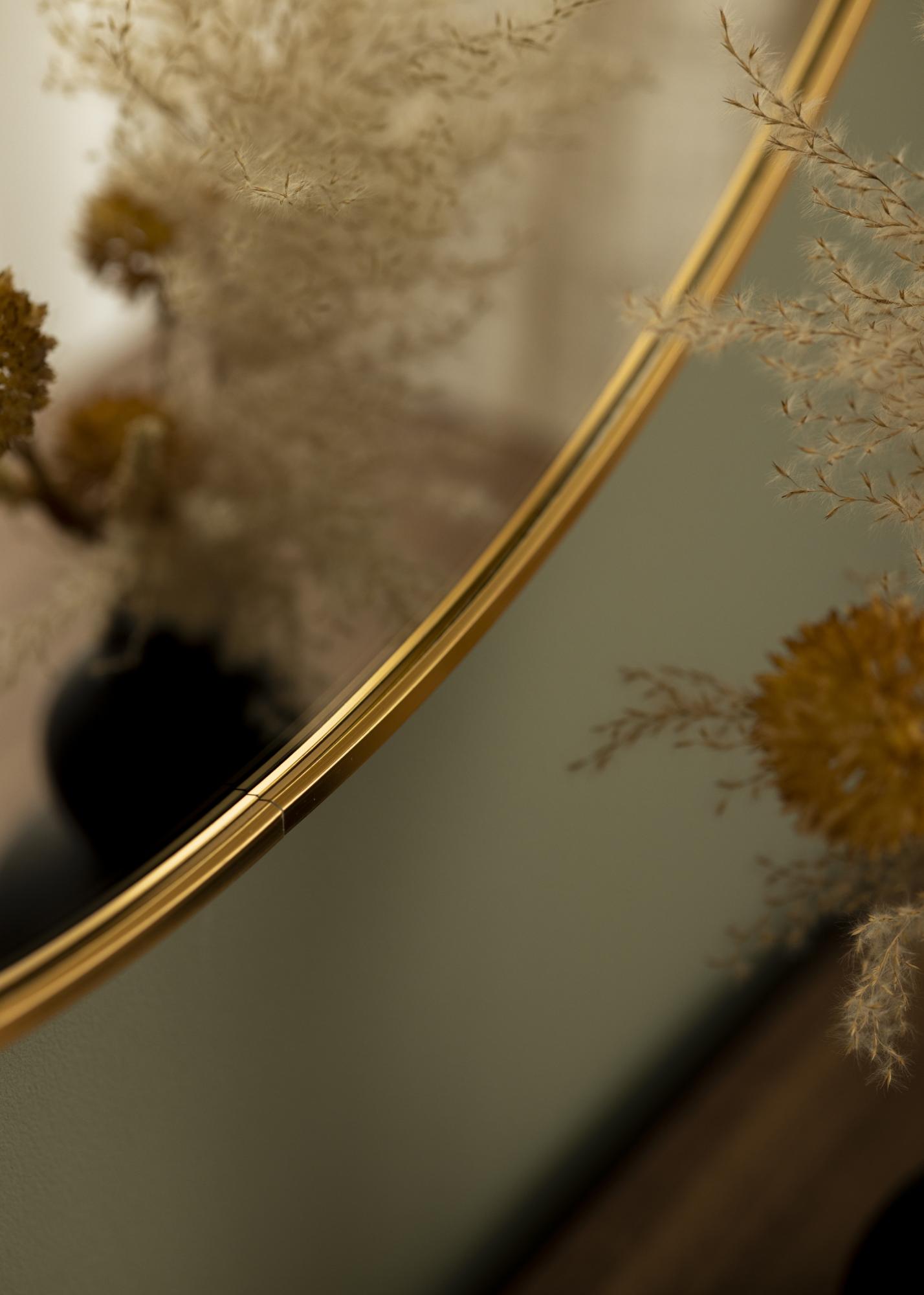 Ümar peegel on stiilse Rootsi disainiga ja metallraam on kauni kuldse viimistlusega. Raamil on harjatud pind, mis annab sellele kaunile kuldsele värvile veidi matima välimuse. Raam on ka trendikalt õhuke, kuid samal ajal – sõltuvalt suurusest – on selle sügavus 30-40 mm, mis muudab selle pisut seinast eemale ulatuvaks ja loob laheda 3D-efekti. Raami sügavus annab peeglile ka tugeva ja robustse tunde, eemaldamata peegli minimalistlikku olemust.