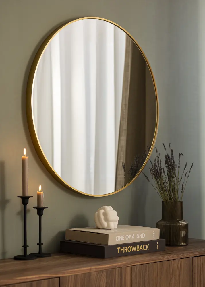 Ümmargune peegel stiilse Rootsi disainiga, millel on metallraam ilusa kulla viimistlusega. Raamil on harjatud pind, mis annab kauni kuldse värvi veidi matima välimuse. Raam on ka trendikalt õhuke, kuid sõltuvalt suurusest on sellel sügavus 30-40 mm, mis muudab peegli seinast veidi ettepoole ulatuvaks ja loob efektse 3D-efekti. Raami sügavus muudab peegli ka soliidseks ja vastupidavaks, eemaldamata samal ajal peegli minimalistlikku tunnetust.