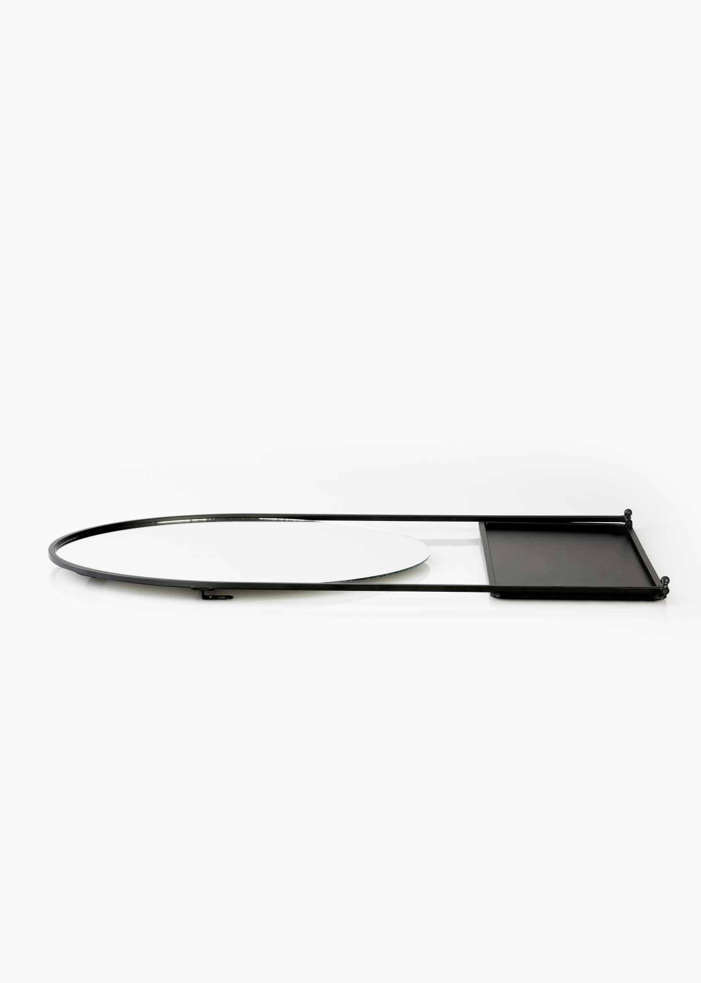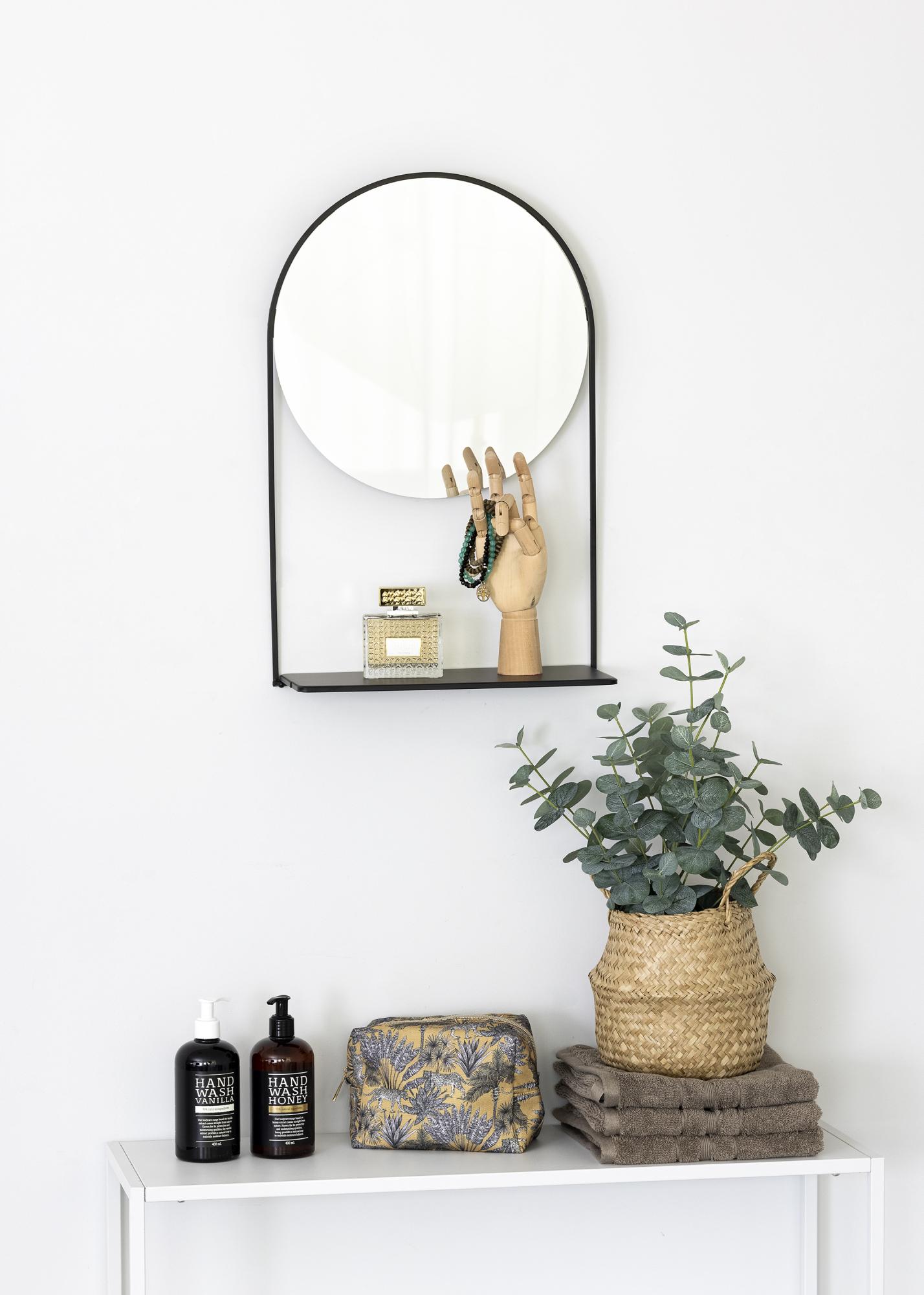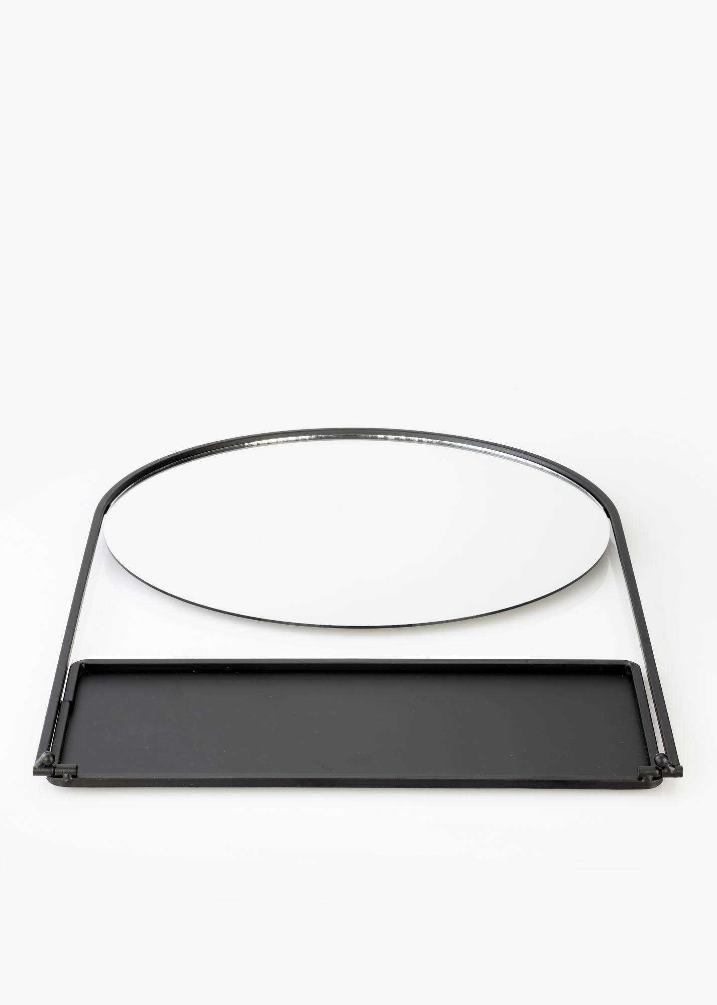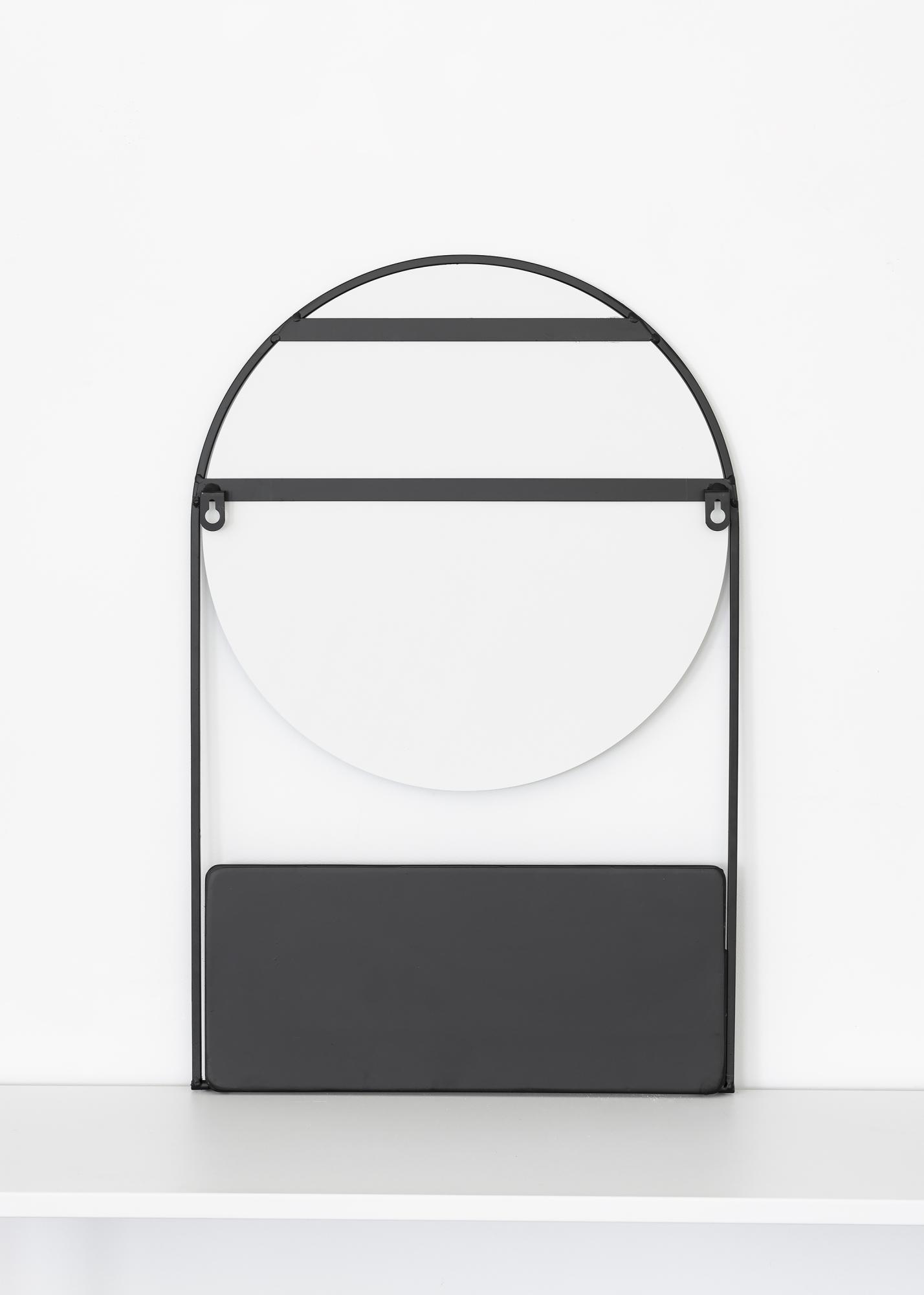 See stiilne riiuliga seinapeegel on Rootsi disainilt KAILA. Peegel on musta värvi ja valmistatud metallist. Peegelpind ise on ümmargune, läbimõõduga 35 cm. Peeglipinda ümbritseb must metalläär ja allosas on riiul - ideaalne kauni dekoratsiooni või meigisäilituse jaoks! Peegel on mõõtmetega 35x55 cm ning sellel on seinakinnitus.