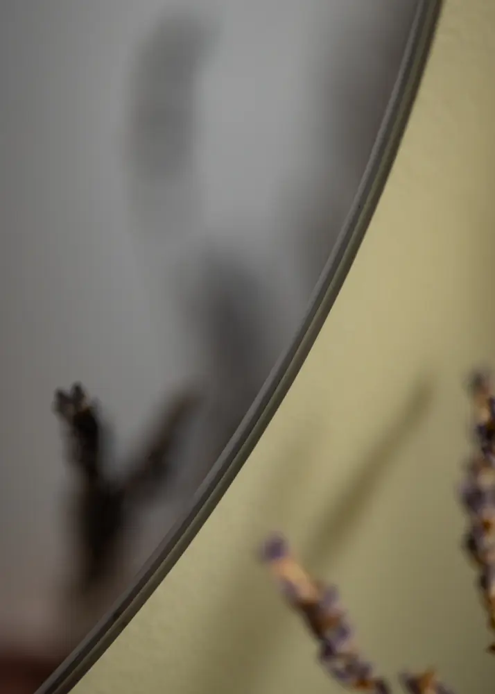 See on ümar ja stiilne peegel, millel on see väike lisaväärtus; elegantne ja efektne hallikas toonitud peegel. See koos peegli minimalistliku kujuga – õhuke ja raamita – loob väga maitsekas terviku. Peegli ümar, pehme kuju kontrastiks külma, hallika tooniga peegliga on samuti stiilne aspekt sellest elegantsest seinapeeglist.