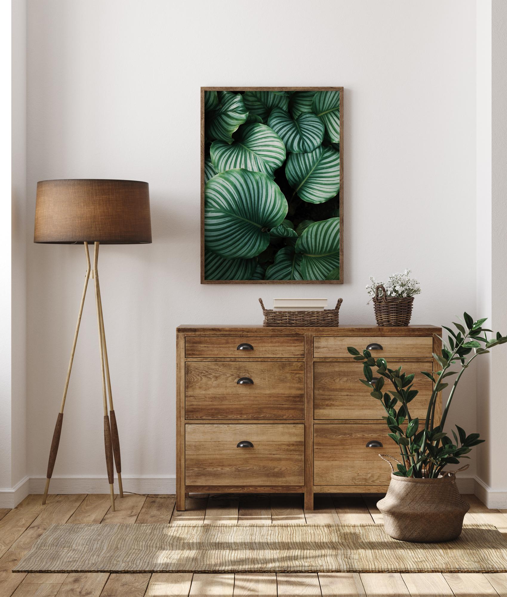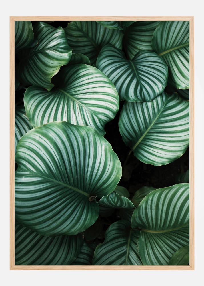 Kaunis plakat linnuperspektiivis tumedate, roheliste kalatea lehtedega. Päikesevalgus kiirgub lehtedele ja loob läbilõikava valguse. Erinevad rohelised toonid loovad intensiivse keskkonna, muutes selle ideaalseks pildiks, mida riputada taimede keskel elutoas.