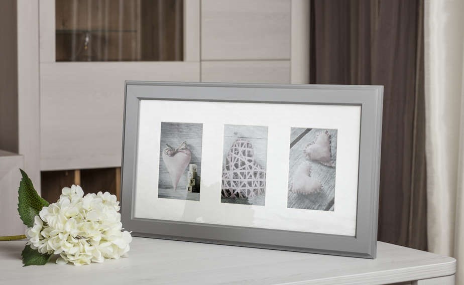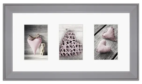 Hall on šikk! Või kuidas see oligi? Igal juhul on see tõeliselt kaunis värv, mida on lihtne sobitada, eriti pastelsetega. Raamige oma kauneimad fotod selle stiilse kollaažraamiga. Raam on valmistatud puidust ja värvitud heledas hallis toonis. Liistul on kaunid detailid ja koos valge passepartout'ga annab see luksusliku terviku.