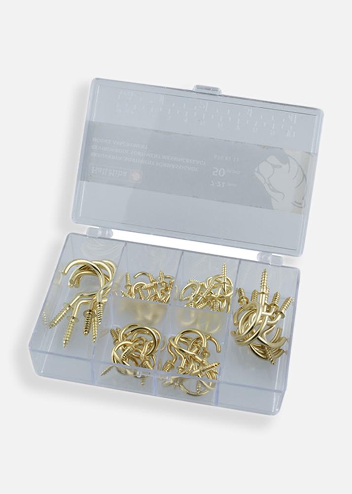 See konksortiment sisaldab 50 messingkattega konksu suurustega 7–21 mm. Ideaalne erinevate riputuste jaoks kodus, olgu see siis maalid, kaunistused või muud väikesed detailid. Praktiline komplekt neile, kes soovivad mugavat ja stiilset paigaldusvõimalust.