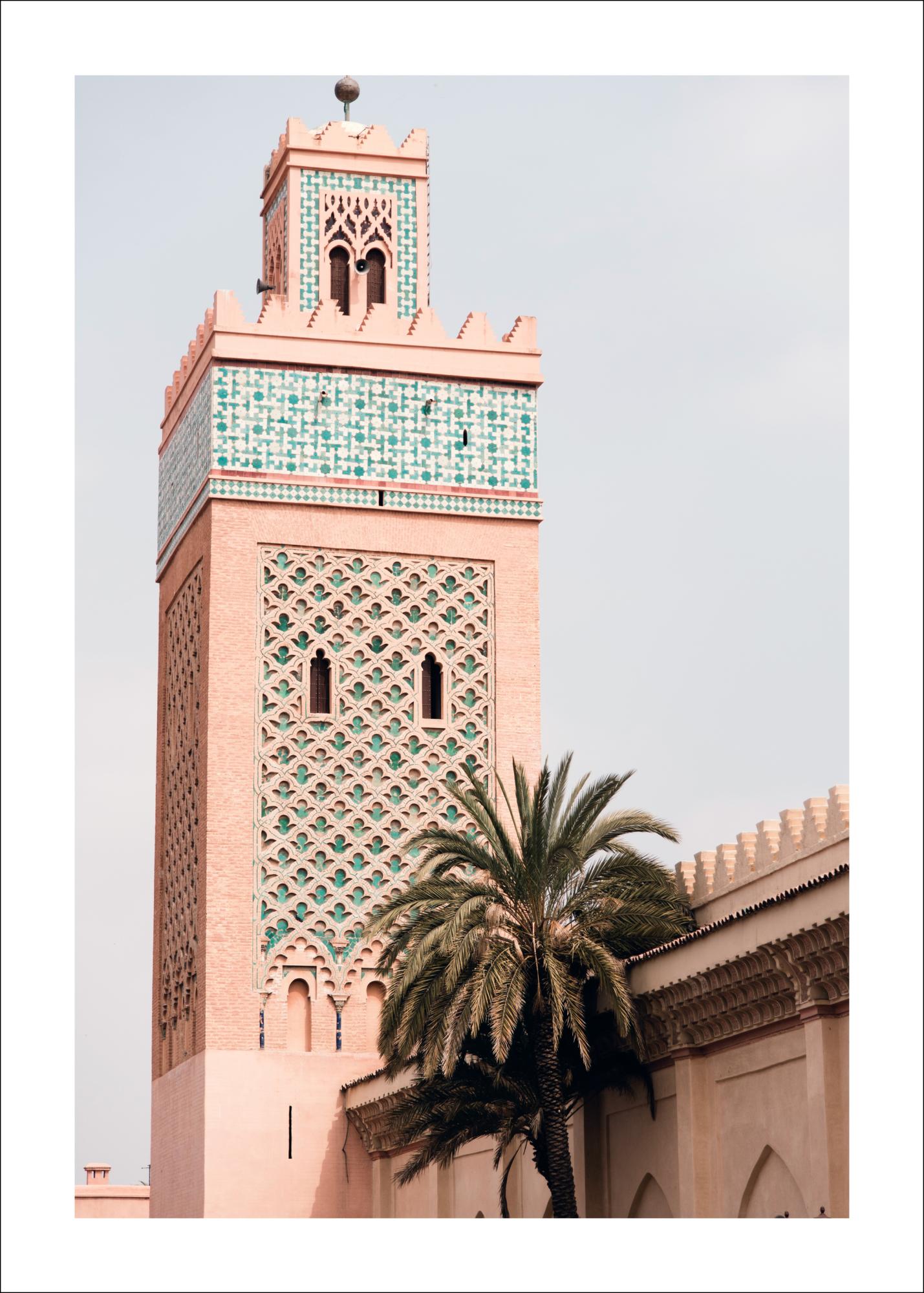 Plakat Marrakechi Kutubiyya mošeega päevavalguses. Kaunid virsiku ja türkiissinise värvid sulanduvad ideaalselt helesinise taeva taustal. Pildi allosas seisab üksik palm oma okstega, mis katavad mošee katuse alumise osa. See virsikuvärvi kivistruktuur loob rahuliku tunde.