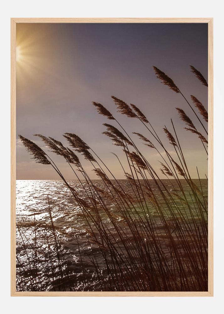 Kaunis päikeseloojanguposter vee ääres. Tulles samal ajal, kui päike vee peale paistab, puhub kuivatatud rohi pehmelt tuules. Pehmed oranžid toonid annavad rahu ja vaikuse tunde. Kohustuslik igas toas majas.