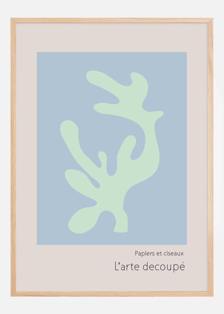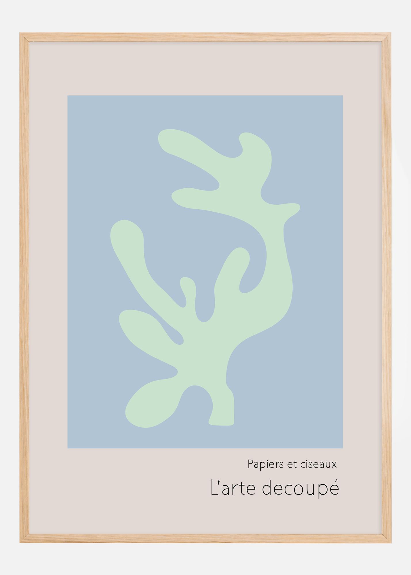 See peen ja minimalistlik plakat austab 'L'arte decoupé'd', paberilõikamise kunsti, mis on elegantne ja ajatu kunstilise väljenduse vorm. See kujutab abstraktset vormi rahustavas pastellrohelises toonis, mis hõljub pehmel sinisel taustal, luues kerguse ja mööduvuse illusiooni. Lihtne vorm, mis on nii orgaaniline kui ka tõlgendamiseks avatud, kutsub vaatajat uurima negatiivseid ruume ja leidma oma tähenduse lõigatud mustris.