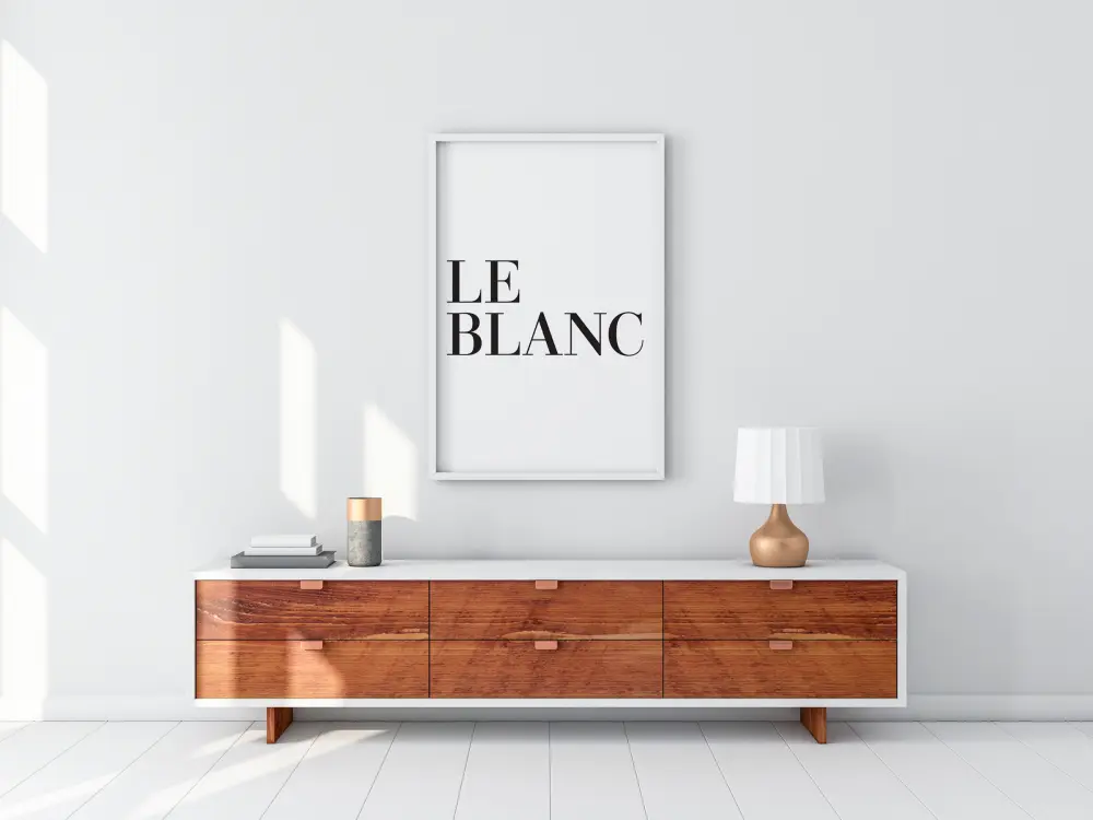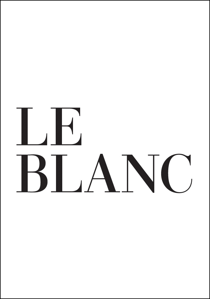 Lihtne ja stiilne tekstiplakat sõnumiga "Le blanc", Valge. Plakat, mis sobib suurepäraselt kaasaegsesse ja minimalistlikku koju ning mis on ideaalne osa suuremast kollaažist.