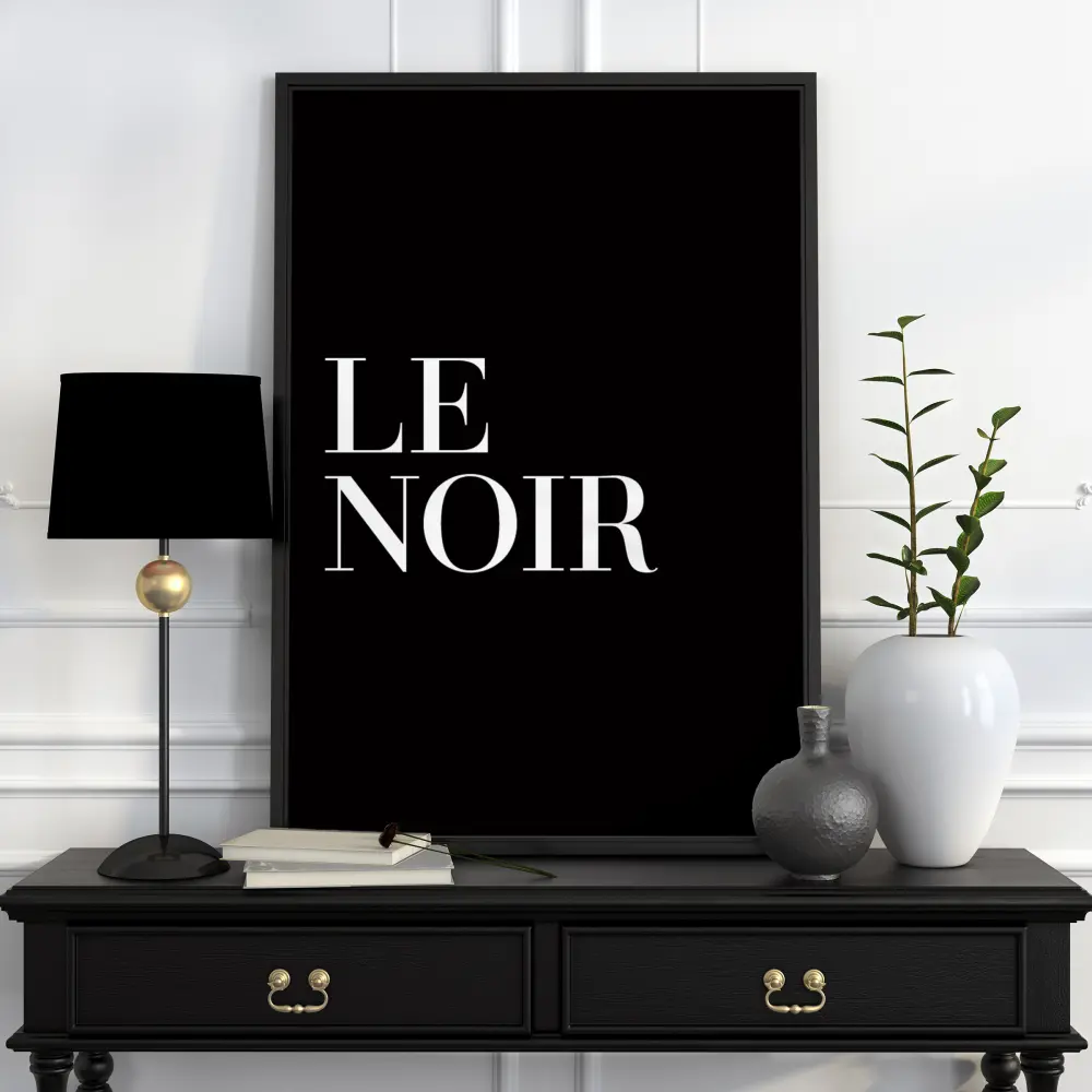 Lihtne ja minimalistlik tekstiposter tekstiga "Le Noir", Must, suurtes valgetes suurtähtedes mustal taustal. Poster, mis sobib suurepäraselt suuremale pildiseinale, ehk koos posteriga "Le Blanc", Valge? Täienda julgelt meie suurest raamide valikust millegagi.