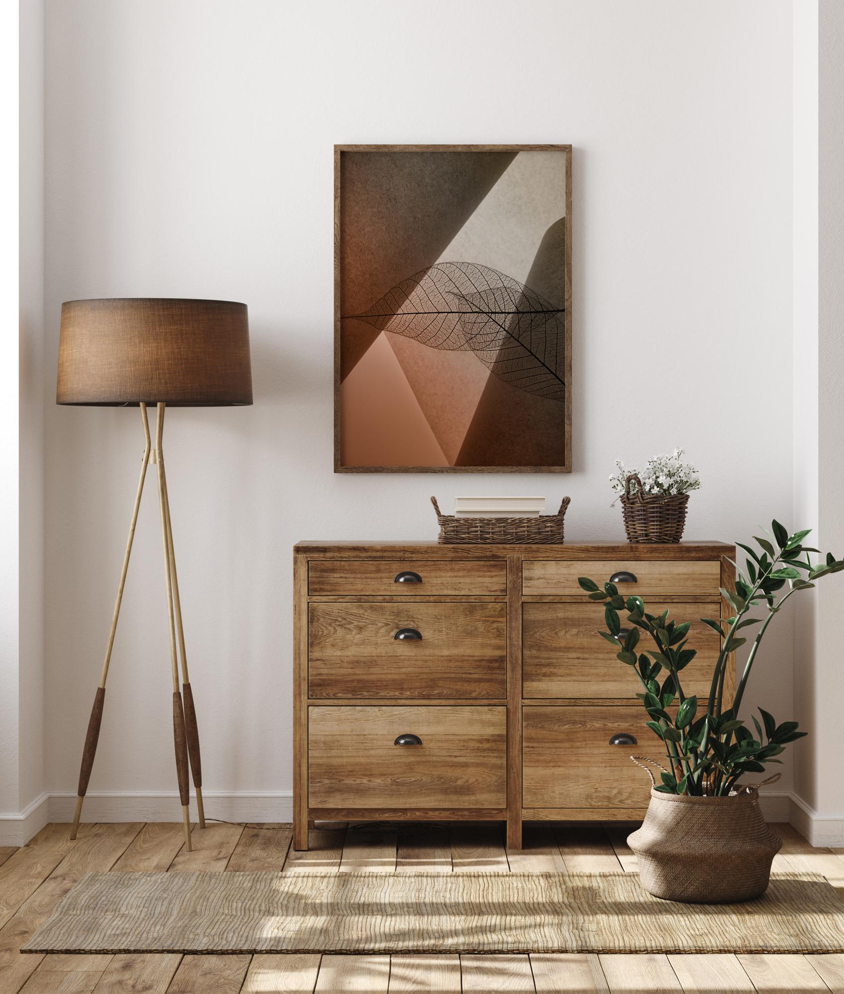 Imeline pilt kahest lehest, mis paistab läbi päikesevalguse. Valguskiir rõhutab lehtede sooni. Kaunist pilti domineerivad erinevad pruunid toonid, samas kui taustal on nii karedaid kui ka siledaid pindu, mis peegeldavad valgust. Täiuslik poster, et tuua ruumi valgust.