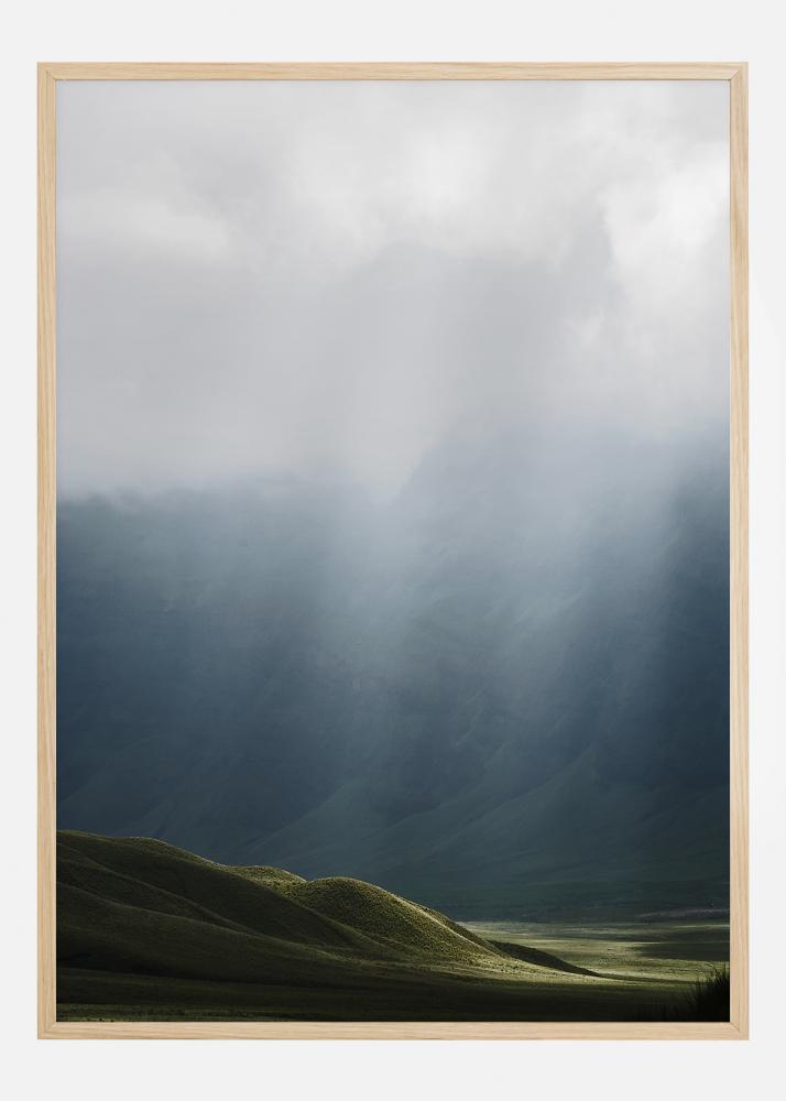 Imeline maastikuposter tumeroheliste küngastega esiplaanil. Teisel pool asuvad kõrged künkad on vaevalt nähtavad varahommikuse udu tõttu. Pehmed rohelised ja hallid värvid loovad rahustava ja lõõgastava atmosfääri. Täiuslik trükk elutuppa riputamiseks.