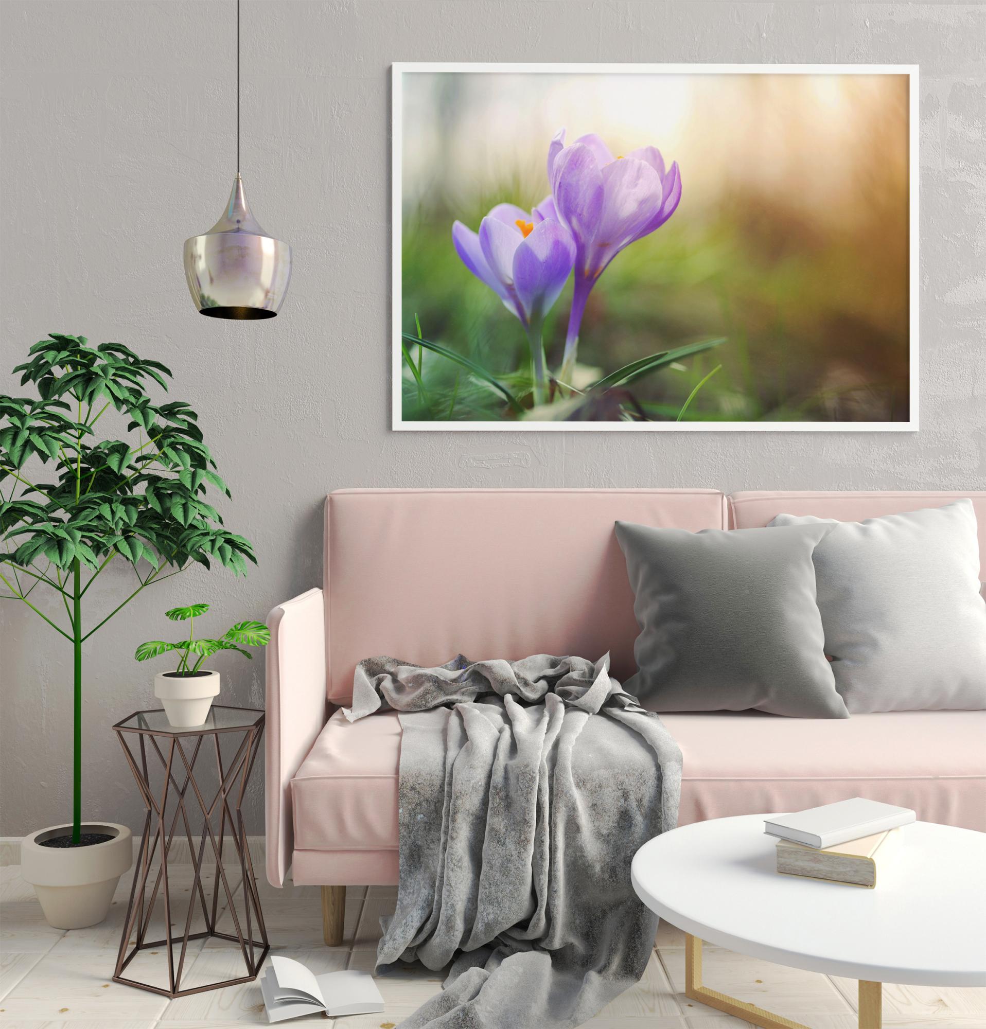 Võluv pilt kevade ehk kõige värvikamast päikesesõbrast, krookusest. Täiendvärvis udune taust tõstab lilledele esile ja annab fotole harmoonia. Sobib neile, kes soovivad koju värvirõõmu, ja alati on kena kasutada pildi tooni aksentvärvina ülejäänud sisekujunduses. Kombineerige meelsasti teiste taimemotiividega, et luua ruumis terviklik tunne.
