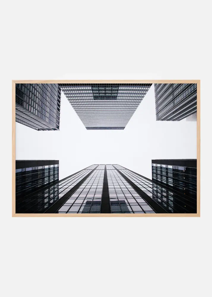 Arhitektuuriplakat kasvavate pilvelõhkujatega pilvevalge taeva taustal. Stiilne pilt tumedatest hoonetest valgel taustal, kus taeva peegeldused on klaasakendes. Täiuslik kingitus kellelegi, kes armastab graafilisi hooneportreesid. Print näeb hea välja mustas raamis, mis tugevdab pildi tumedust ja on ilus koos teiste arhitektuurifotodega.