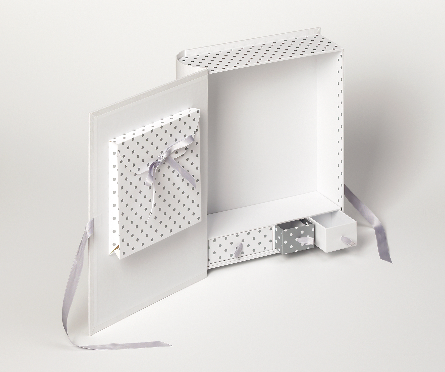 Ilus hoiukarp piltidele ja väikestele esemetele. Karbis on 3 väiksemat sahtlit, mis sobivad suurepäraselt näiteks esimesele hambale. Samuti on olemas hoidmiseks kilekott, mida saab sulgeda. Kasti esiküljele saate panna oma pildi, et luua isiklikku ilmet.