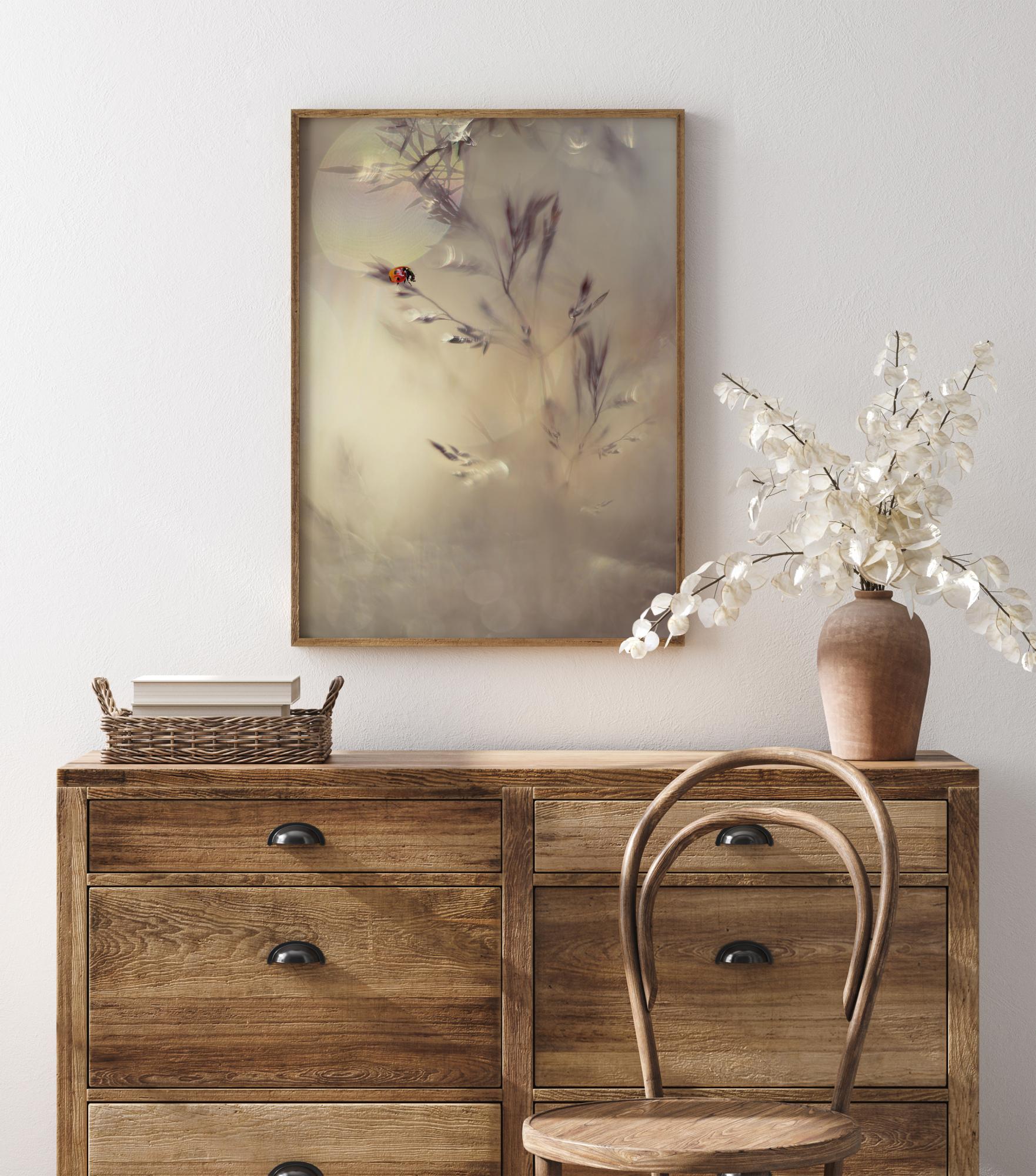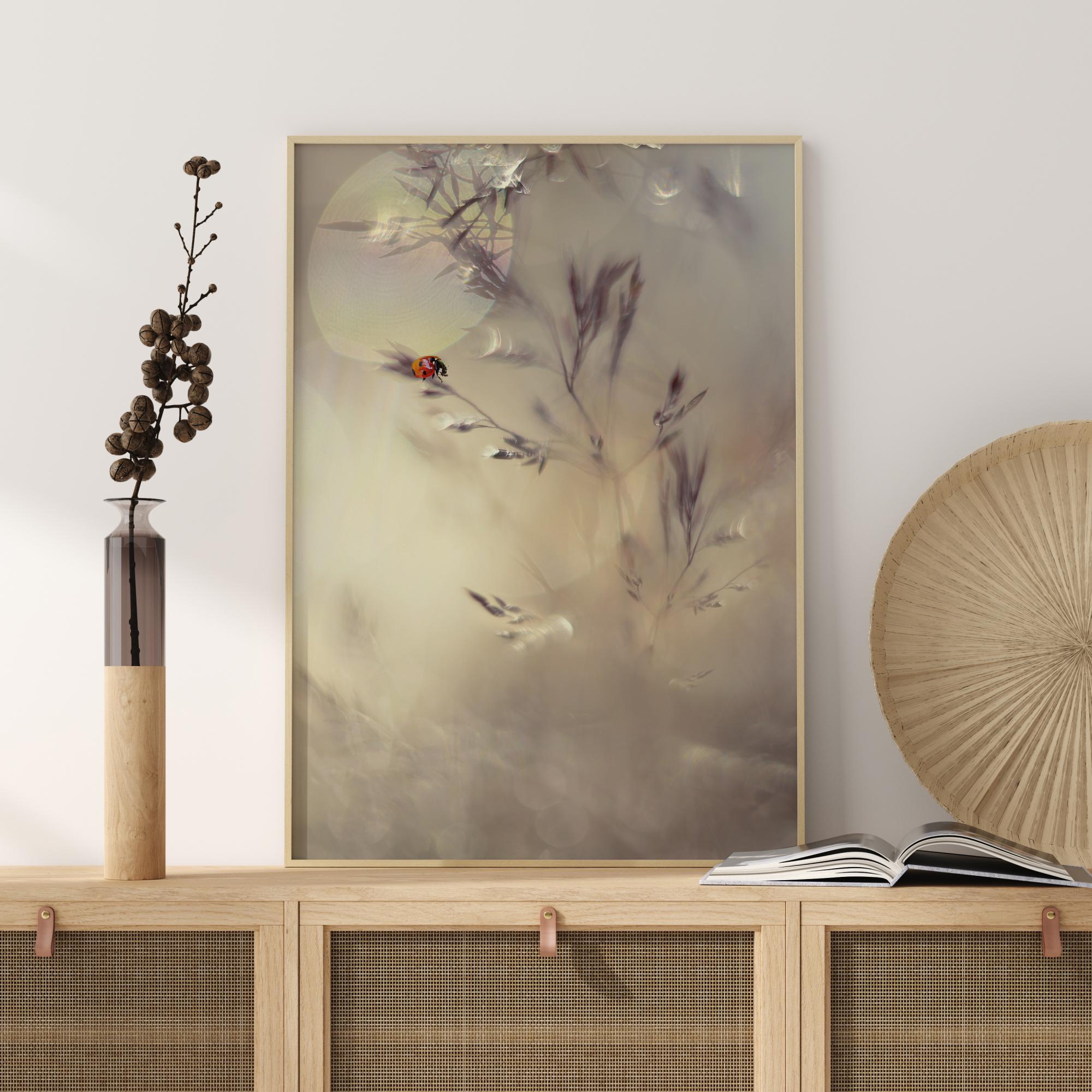 Uduseks poster kauni leedukaga kuivanud rohul. Päikesevalguse kaugel peegeldudes paistavad selgelt leeduka tugevad mustad ja punased värvid. Kaunid, udused värvid edastavad rahu ja vaikuse tunnet. Kaunis trükis, mida riputada magamistuppa.