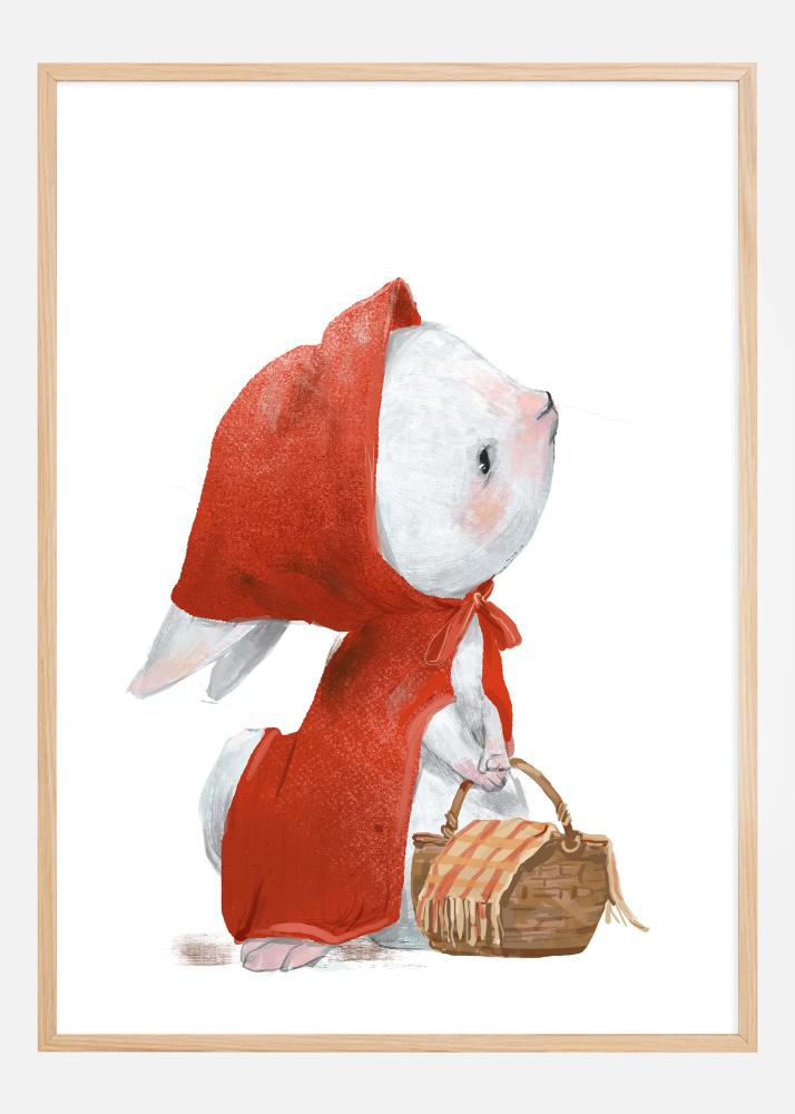 Selle võluv plakat kujutab Punamütsikese klassikalise muinasjutu uut tõlgendust, mille peategelaseks on armas väike jänes. Jänes on riietatud ereda punase kapuutsiga ja kannab korvi, mis annab kuulsa jutustuse sõbralikule noogutusele. Akvarellitehnika lisab pildile pehme ja unenäolise elemendi ning õrnad pintslitõmbed toovad esile jänese süütuse ja illustratsiooni mängulise iseloomu.