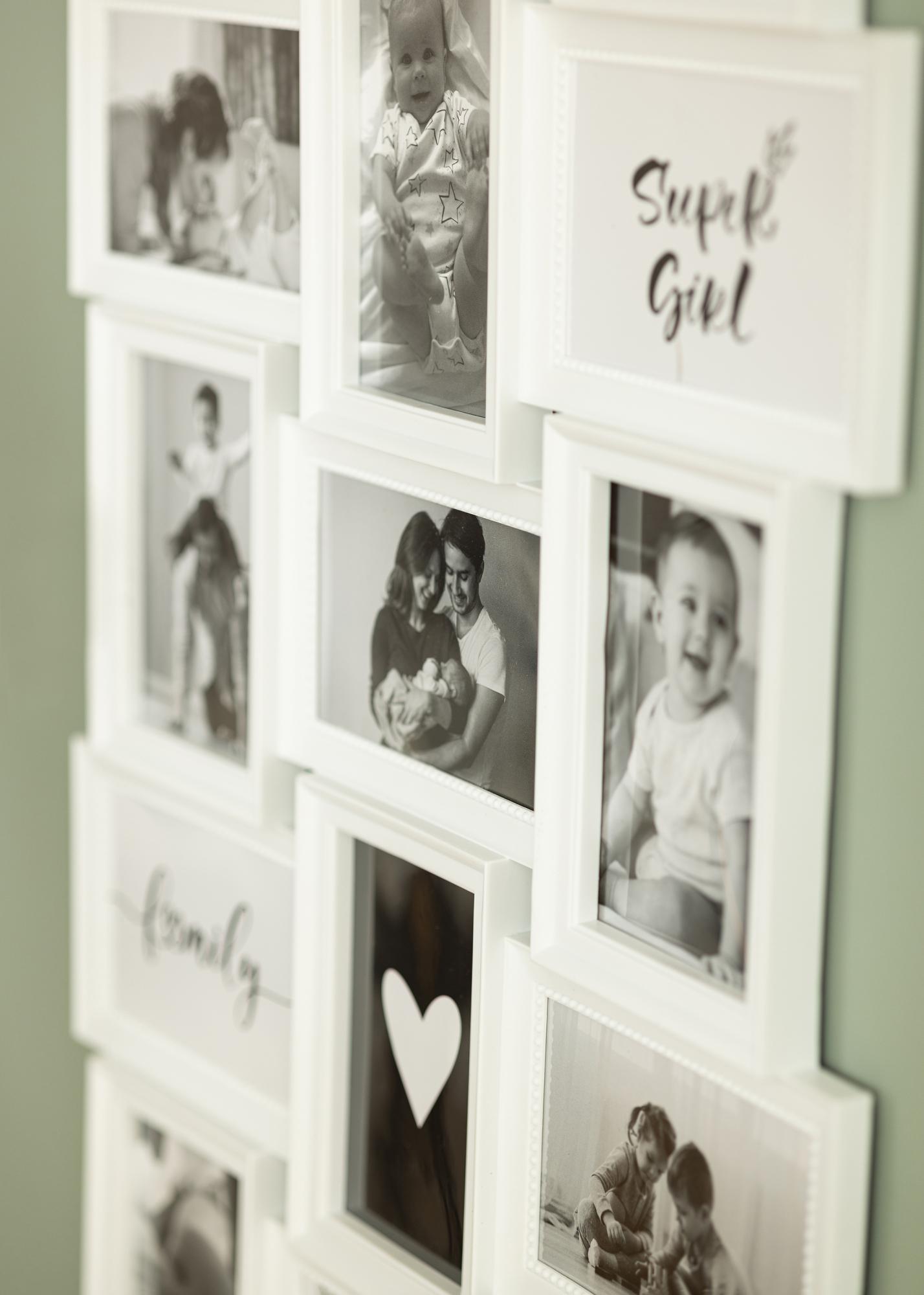 See kollaažraam mahutab lausa 21 pilti suuruses 10x15 cm. See võimaldab sul paigutada kõik oma lemmikfotod sugulastest, sõpradest ja perest. Kui kombineerid oma fotosid tsitaatide või graafiliste motiividega, saad riputuse, mis on nii ilus kui põnev!