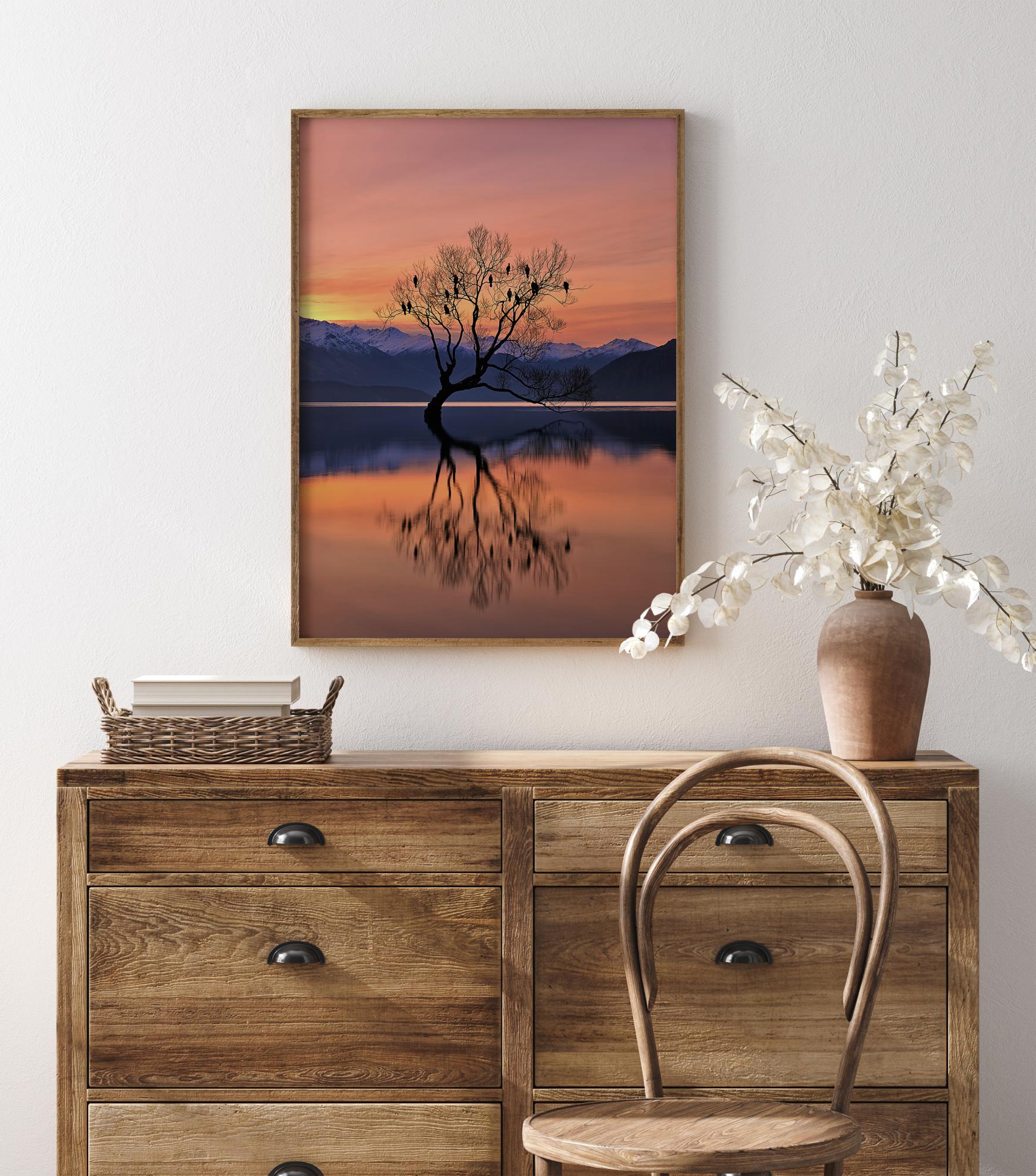 Kaunis loodusposter üksiku puuga järve keskel. Linnud istuvad rahulikult okstel, pastelltoonides trükk peegeldab puud järves, luues täiusliku peegeldusefekti nii loodusele kui ka värvidele. Kuula vaikust selle rahustava pildi sees.