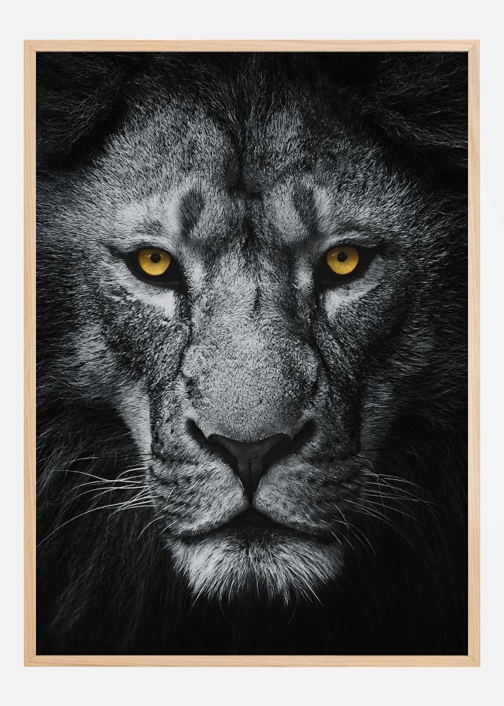 Seda julget ja sugestiivset plakatit kujutab lõvi portree muljetavaldava detailsusastmega. Pilt on mustvalge, välja arvatud lõvi silmad, mis säravad eredas ja elavas kollases värvitoonis, luues motiivis vastupandamatu tähelepanupunkti. Läbimõeldud värvi ja kontrasti kasutamine tekitab intensiivsuse ja kohalolu tunde, mis köidab ja hoiab vaataja tähelepanu. See plakat on täiuslik neile, kes otsivad oma sisekujundusse metsikut ja loomulikku jõudu.
