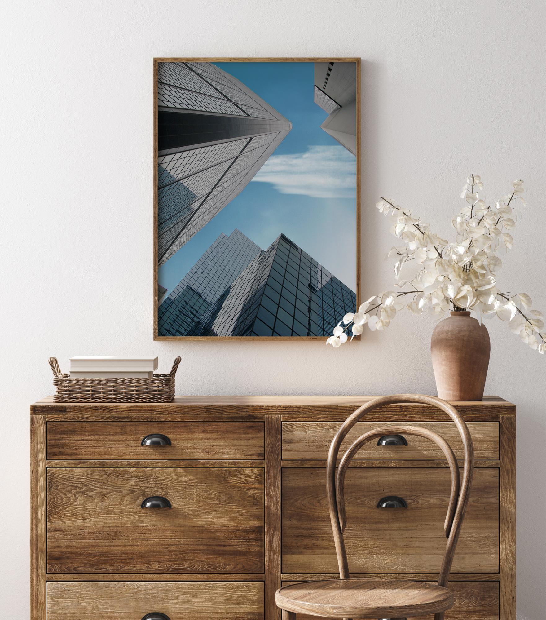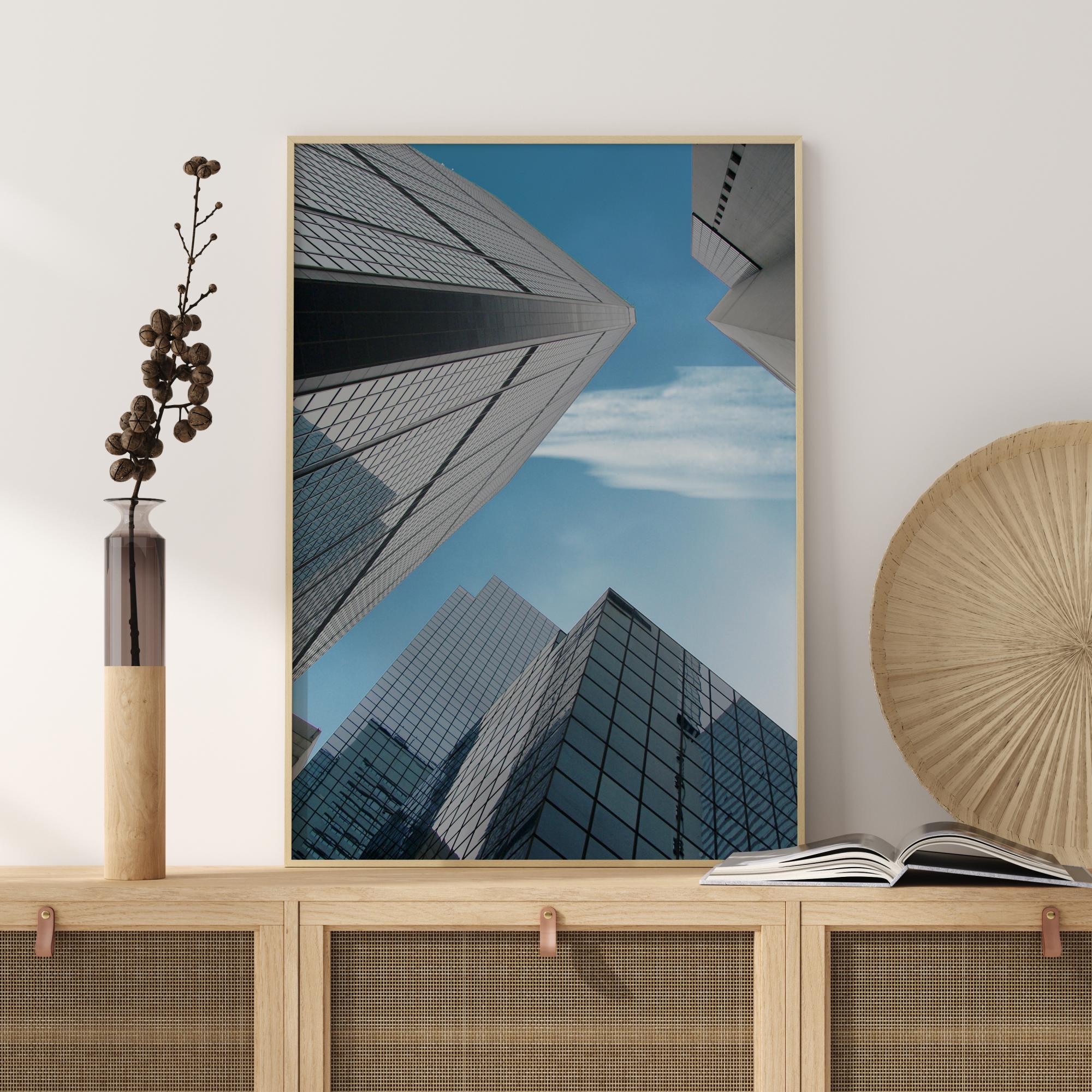 Hingematuk arhitektuurne trükk peegliga akendega hoonetest. Vastu võetud konnaperspektiivist, annab see poster suurejoonelisuse tunde. Kaunis helesinine taevas ühe valge pilvega annab sellele kaunile pildile lisa värvitooni. Ideaalne väiksemasse ruumi, et anda väikesele ruumile lõpmatuse tunnet.