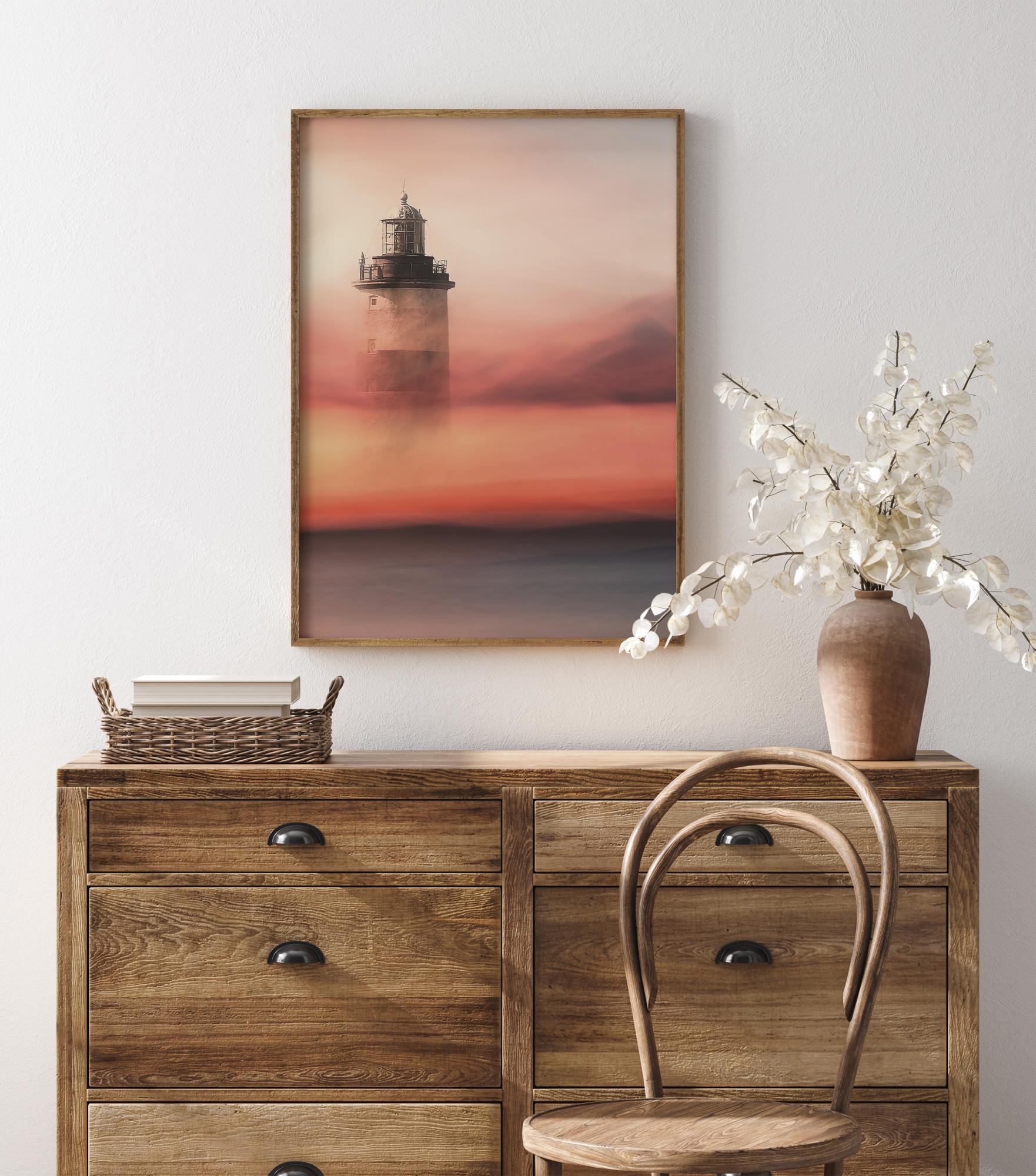 Kaunis romantiline trükk majakast mereudu sees. Pehmed, roosad pastellvärvid loovad romantika tunde, samas kui pehme sinine meri lisab sellele kaunile plakatile tumedama tooni. Tunneta ja kuula meretuult, kui riputad selle pildi oma koju.