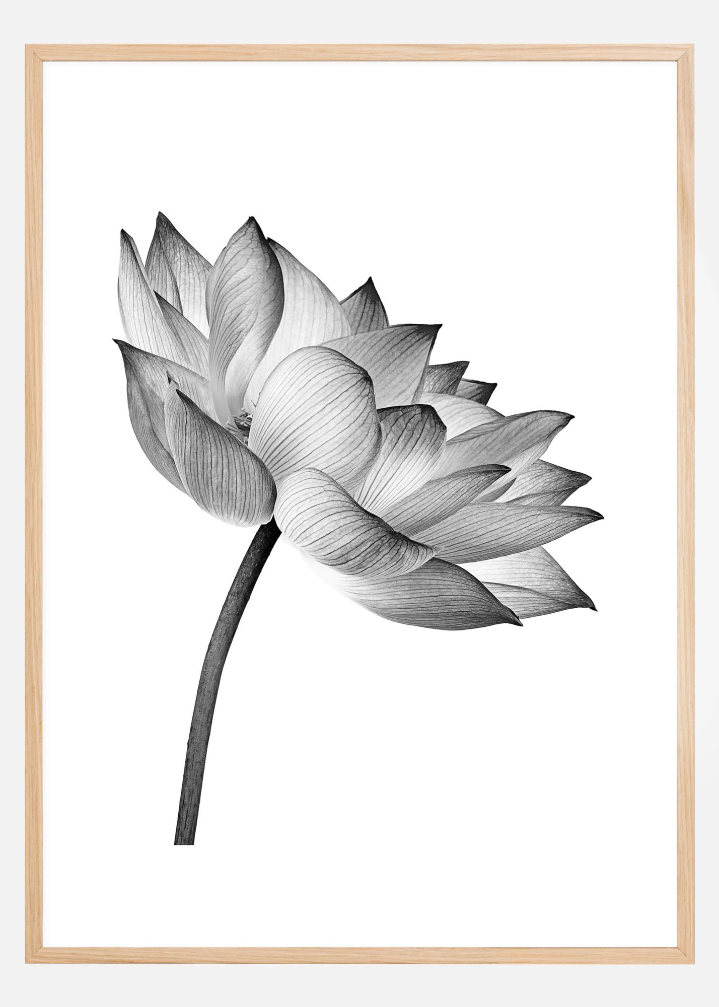 Mustvalge graafiline plakat, millel on valgel taustal puhkend lootoslill. Stiilne ja minimalistlik plakat, mida on lihtne kombineerida teiste lemmikutega suuremal pildiseinal.