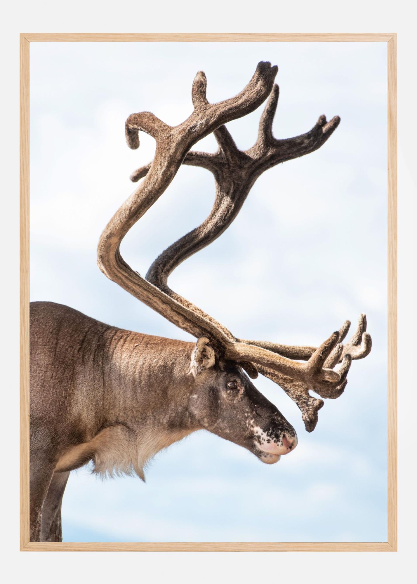 See motiiv kujutab profiilis uhket põhjapõtra, kellel on muljetavaldavad, harulised sarved pehme ja heleda taeva taustal. Pilt on looduselementidest inspireeritud ning põhjamaiselt väljapeetud, sobides suurepäraselt postrina või plakatina elutuppa, magamistuppa või mägimajja. Detailirohke foto loob metsiku looduse, rahu ja jõu tunde ning on loomulik valik, kui hindad loomamotiive, skandinaavia disaini ja trendikaid loodusprinte.