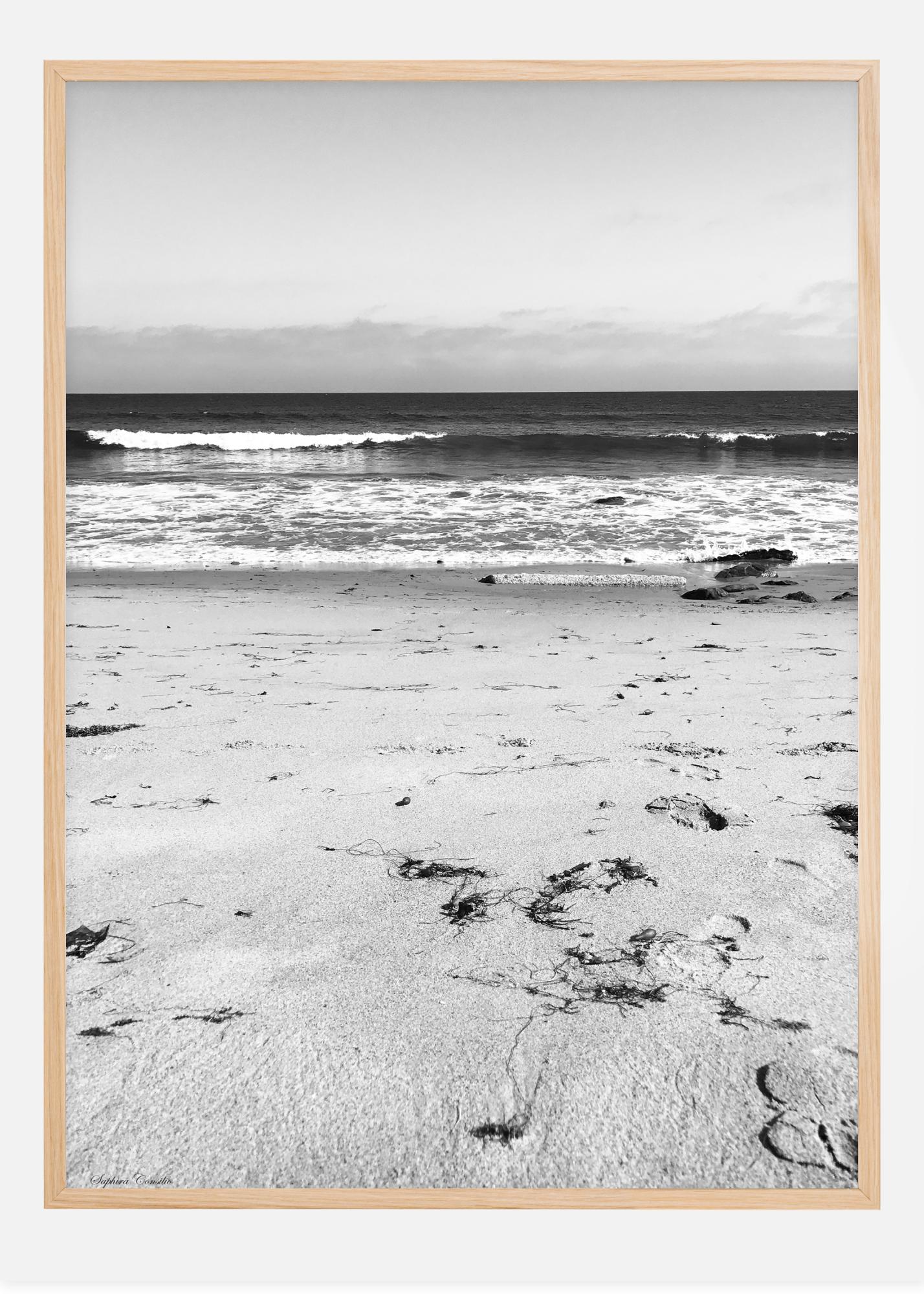 Loodusfoto mustvalgelt, kus vahutavad lained uhuvad üle rahuliku ranna. Mõned kerged sammud liivas on ainus märk inimeste kohalolust. Rahulik ja harmooniline plakat, mille autor on fotograaf Saphira Consilio.